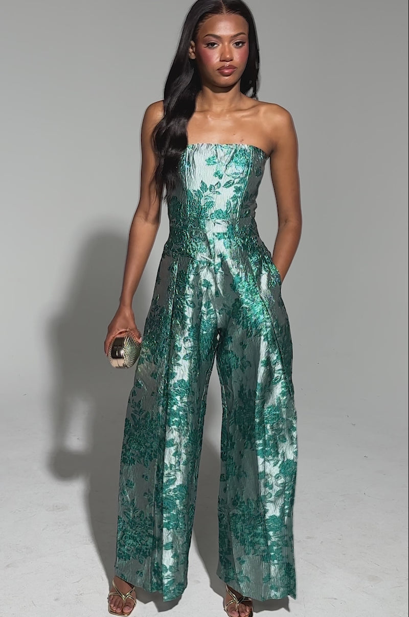 You’re one of a kind, baby! The AKIRA Label No One Like Me Printed Jumpsuit is crafted from a lustrous, brocade fabric with metallic floral detailing and features a strapless neckline with inner elastic trim, a snug bodice with structural inner boning, an elasticized ruched back panel, on-seam waist pockets, front pleating on the pant legs, and a metallic back zipper closure. Complete with a flowy, wide-leg silhouette. Try pairing with platform pumps, a metallic clutch, and chunky jewelry for a knockout finish.