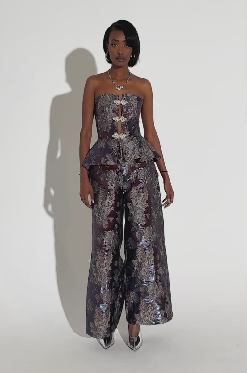 The holidays just got a little brighter when you step out in The AKIRA Label Odessa Brocade Trouser. These gorgeous bottoms are crafted from a shining, color-shifting metallic fabrication and feature an intricate floral brocade patterning throughout, a high rise design, an elasticized panel on the back of the waistband for a comfortable fit, side slant pockets, tonal seaming, and a concealed metallic front zip closure with dual hook and bar fastenings. Complete with a wide leg silhouette. Pair with the matching AKIRA Label Odessa Brocade Blazer, kitten heels, and a red lip for a finished look.