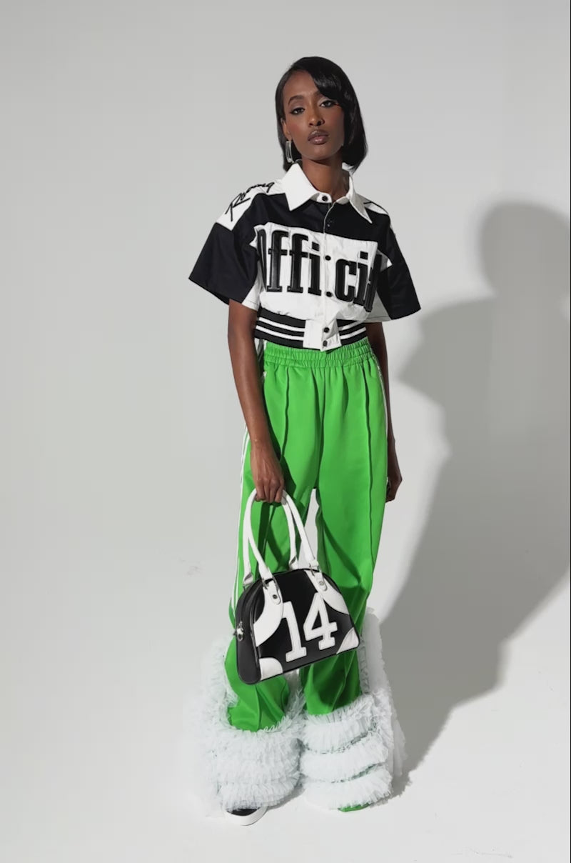 Ready to clock in with The AKIRA Label Official Duty Cropped Button Down. This stylish top is crafted from a non-stretch, lightweight cotton base and features a color block pattern throughout, a pointed collar, the embroidered phrase “Racing” on the shoulders, short sleeves, an elasticized waistband with striped detailing, and the phrase “Official” across the chest in a sleek faux leather. Complete with contrast button down closures, and a boxy, cropped silhouette. Pair with baggy cargo pants, and combat boots for a finished look.