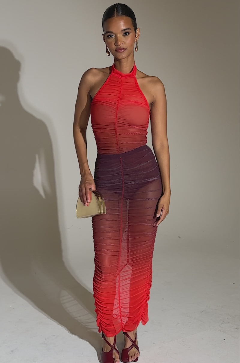 Turn up the temp in The AKIRA Label Oh Fire Ombre Maxi Skirt. This sultry midi skirt is crafted from sheer, stretchy mesh and features a sizzling ombré gradient, flattering all-over ruched detailing that sculpts the waist, a subtle back slit, and a curve-hugging silhouette. Pair with the matching AKIRA Label Oh Fire Ombre Mesh Bodysuit, strappy stilettos, and gold jewelry for a luxe, summer-ready ensemble.