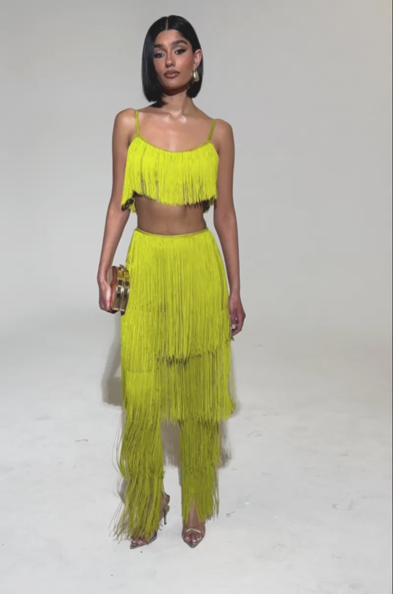 Shake and shimmy in The AKIRA Label Oh So Fringe Top in Green. Crafted from a sleek, stretchy fabrication, this bra top features a snug, supportive fit, an ultra-cropped silhouette, adjustable cami straps, a metallic back zipper closure, and tonal fringe detailing that moves with every step. Style with the coordinating Oh So Fringe Pants in Green for a fun, festive finish.