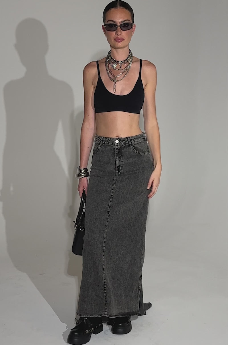 OH THE DRAMA DENIM MAXI SKIRT WITH TRAIN IN GREY