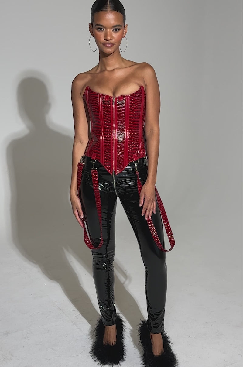 HYFR. The AKIRA Label Oh Yeah Corset is crafted from textured faux crocodile leather with a high-gloss finish. It features a sexy strapless design, internal structural boning, a pointed hem, front zipper closure, and an adjustable lace-up back closure to ensure a cinched silhouette. Complete with a silky, satin-lined interior and detachable garter straps that cascade from the hem.