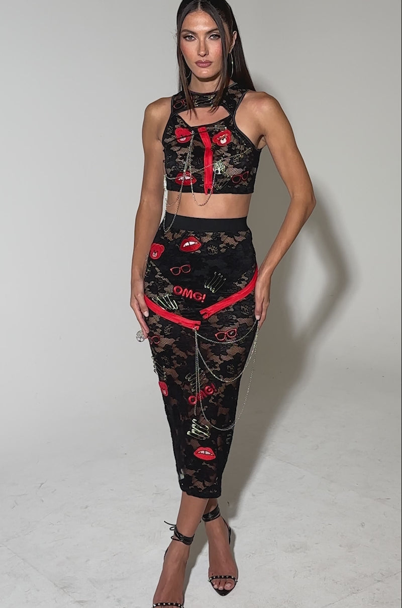 Leave them speechless when you wear The AKIRA Label OMG Lace Tank with Embellishments, a daring statement top that fuses punk-inspired details with playful graphic energy. Crafted from sheer floral lace, this cropped tank features a rounded neckline, a sleeveless design, a sultry cut out on the chest, and red embroidered patches, a coordinating zipper trim, paired with metal safety pin accents and draped chain details for a rebellious edge. Complete with a back zipper closure. Style it with the matching AKIRA Label OMG Lace Maxi Skirt With Embellishments, knee-high stiletto boots, and a vampy lip to step out in style and drama.
