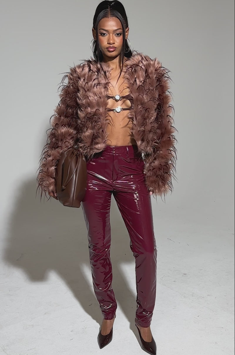 I smell smoke! The AKIRA Label On Fire Faux Leather Legging is crafted from ultra-glossy faux patent leather in a rich burgundy hue. It features a high-rise, skinny-leg silhouette, a five-pocket design, functional belt loops, soft inner lining, and a zip-button front closure.