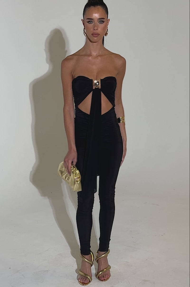 Made to shine in The AKIRA Label One of a Kind Cutout Jumpsuit. This trendy jumpsuit is crafted from a luxe stretch fabric and features a strapless neckline, a faux gold metallic hardware chest centerpiece with a draped center panel that cascades down the bodice, a sultry cut out on the stomach, and sultry ruched detailing along the hips and legs that sculpts the silhouette. Complete with a skinny leg silhouette. Pair with platform pumps, a vampy lip, and a statement necklace for your next GNO.