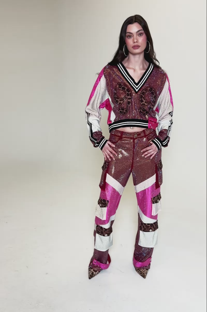 The AKIRA Label Only The Coolest Rhinestone Pant is a jaw-dropping fusion of glam and spot. These blinged-out cargo pants boast a bold color block, paneled construction, a high-rise fit, functional belt loops, a four-pocket design with additional leopard-print cargo pockets lining the pant legs, snap-button strap details at the pant cuffs with bungee cord closures for an optional cinched look, and a button-zip front closure. Totally adorned in an assortment of glittering rhinestone embellishments, and complete with a relaxed, wide-leg fit. Style with the matching AKIRA Label Only The Coolest Rhinestone Jersey Sweatshirt, platform sneakers, and mini sunnies for a finished look.