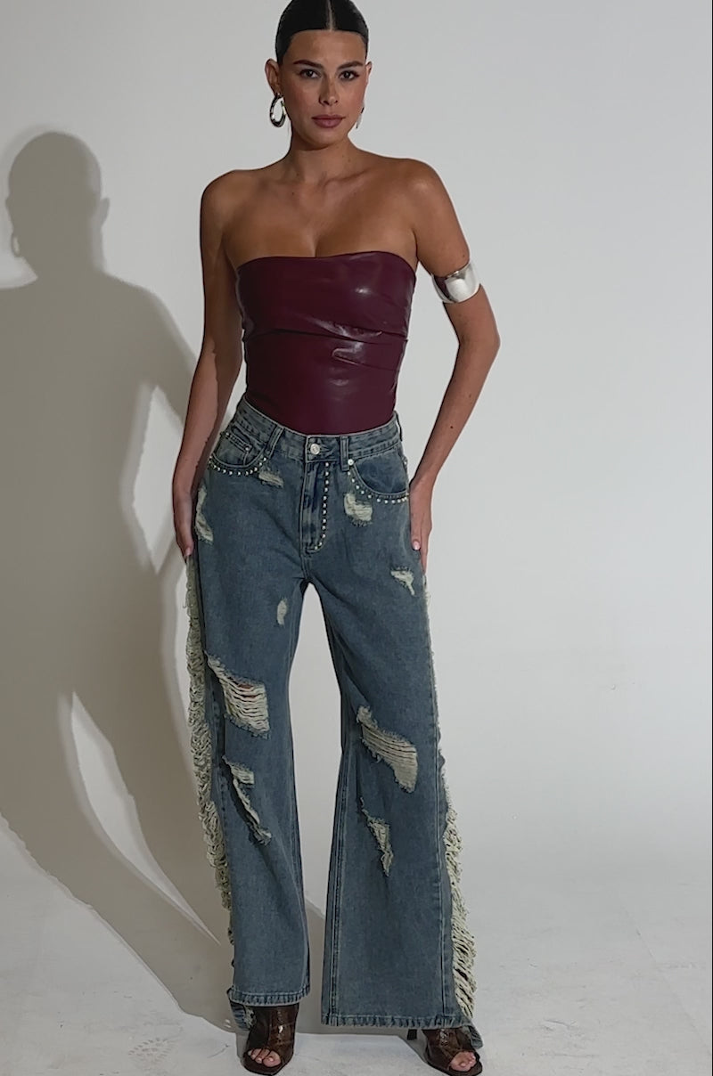Grunge meets glam with The AKIRA Label Over It Distressed Relaxed Denim. These effortlessly ripped jeans are crafted from a medium-wash, non-stretch denim and feature a high-rise design, functional belt loops, a classic five-pocket design, heavy distressing and shredding along the sides and front of the pant legs, and silver-tone metallic stud detailing that line the front pockets and front button-zip closure. Complete with a relaxed, wide-leg silhouette. Style with anything from racerback tanks to baby tees for an elevated everyday look.