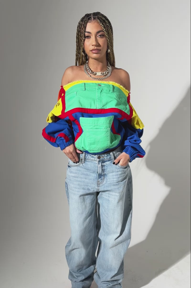The AKIRA Label Patch Me Up Sweatshirt can fix any broken heart! This fun piece is crafted from a non-stretch cotton denim base and features a bold color block paneled construction, an off-the-shoulder neckline with distressed detailing, unique belt loop and button zip detailing at the top hem, strappy button detailing at the top of the shoulders, long sleeves with striped detailing running down the sides and elastic cuffs, an oversized kangaroo front pocket with a smaller pocket accent, and a coordinating elasticized waistband. Complete with a cropped silhouette. Pair with corduroy pants and chunky sneakers for a zany ensemble.