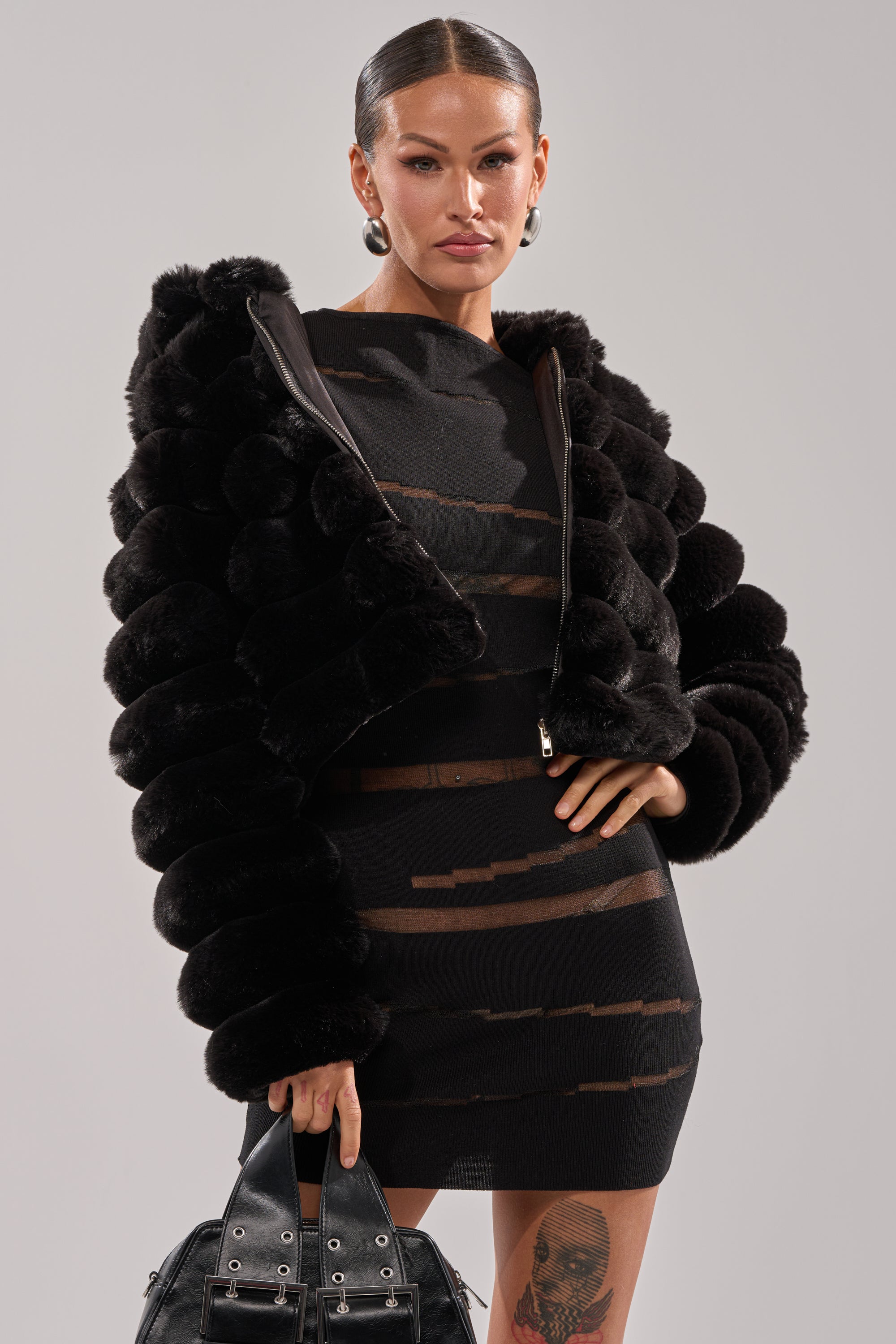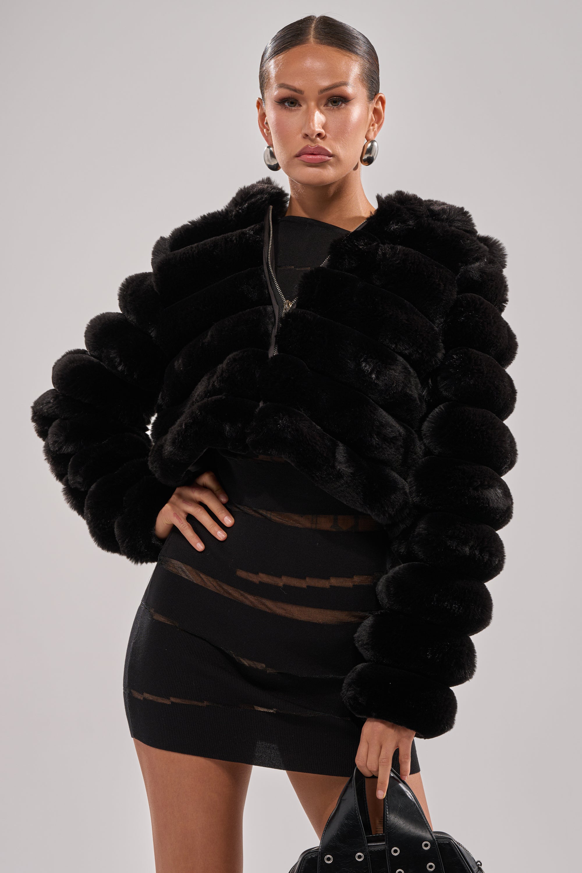 Make any fit a little bit cuter this winter with The AKIRA Label Popcorn Faux Fur In Black. This cozy piece is crafted from an uber fluffy, lush faux fur base and boasts a puffy, paneled construction, an attached hood, long sleeves, and a tonal silky inner lining. It’s complete with a metallic front zip closure, and a boxy, cropped silhouette. Pair with denim and booties for a finished look.
