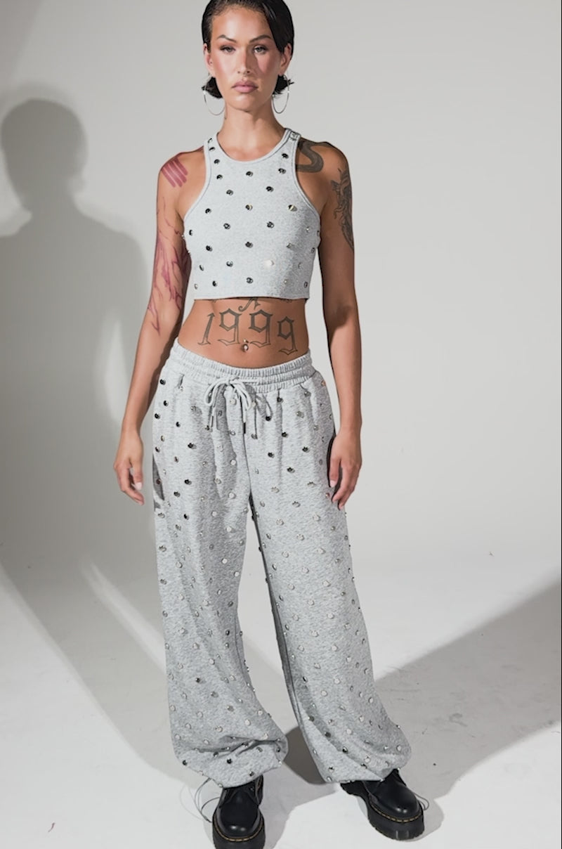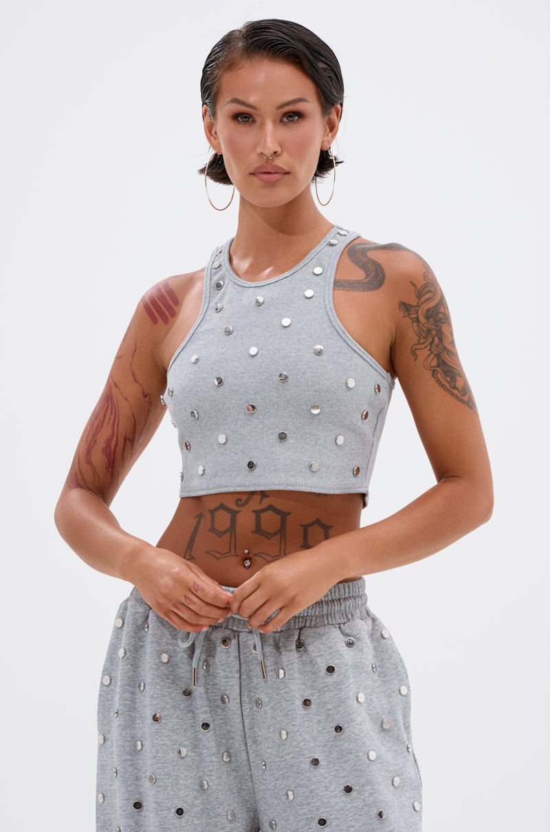 OK, sis, go off! The AKIRA Label Popping Off Tank is an elevated interpretation of a classic ribbed tank. Crafted from a soft, stretchy cotton blend, it features a cropped, form-fitting silhouette, thick tank straps, a scoop neckline, and flat-faced, silver-tone stud embellishments throughout. Wear it with the coordinating Popping Off Sweatshirt and Joggers for a stylish, leisurely vibe.