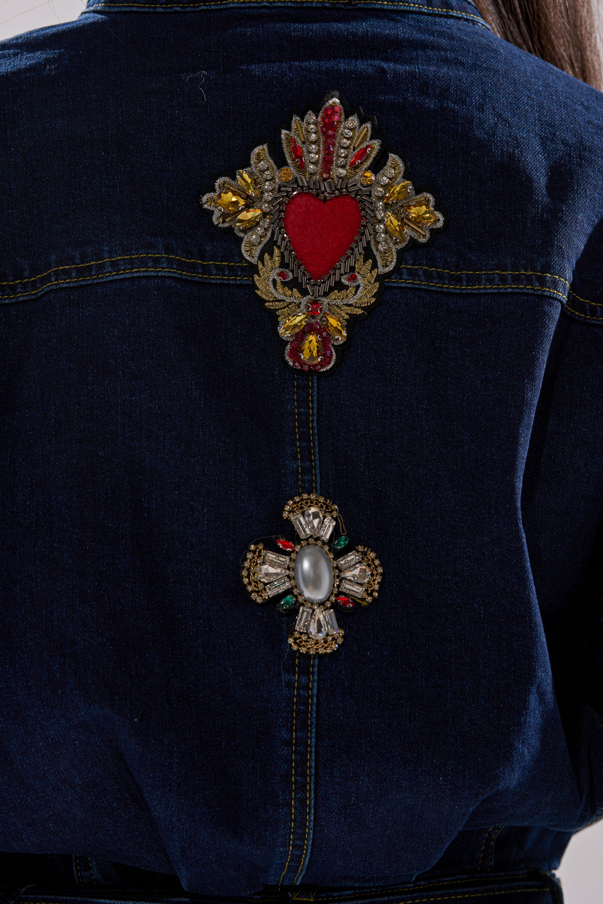 Denim meets divinity in The AKIRA Label Prettiest Problem Denim Patchwork Mini Dress. Crafted from deep indigo denim, this statement piece features a structured mini silhouette with a high mock neck with a snap-button fastening, a drop shoulder design, long sleeves, dual waist pockets, and a belted waist with a gold-tone buckle that cinches the figure for a flattering fit. It’s adorned with ornate appliqués of bejeweled crosses and sacred heart motifs, each embellished with pearls, beads, rhinestones, and metallic accents for a stunning finish. Complete with a concealed front zipper closure. Style with moto boots and metallic accessories for a heavenly ensemble.