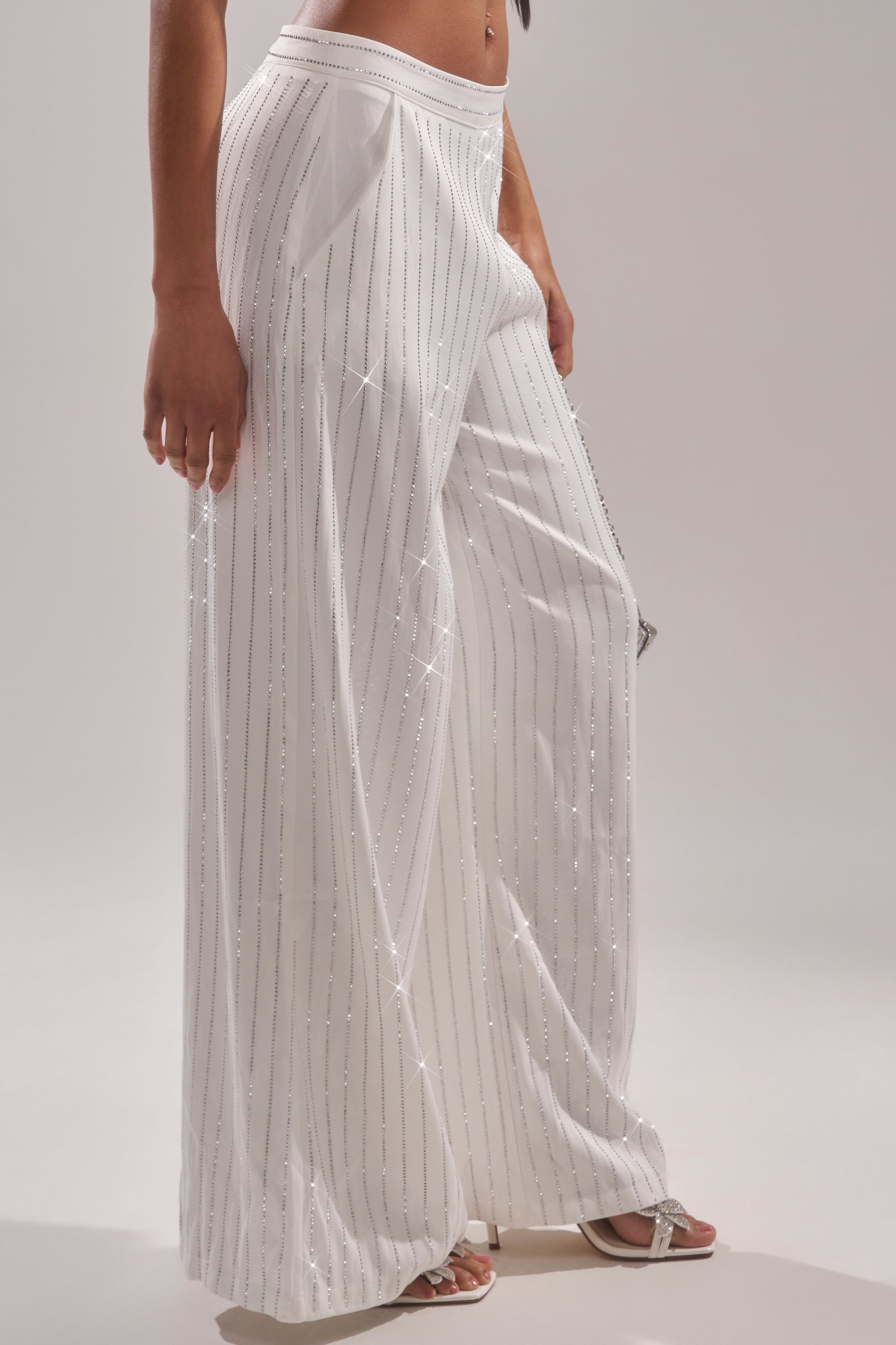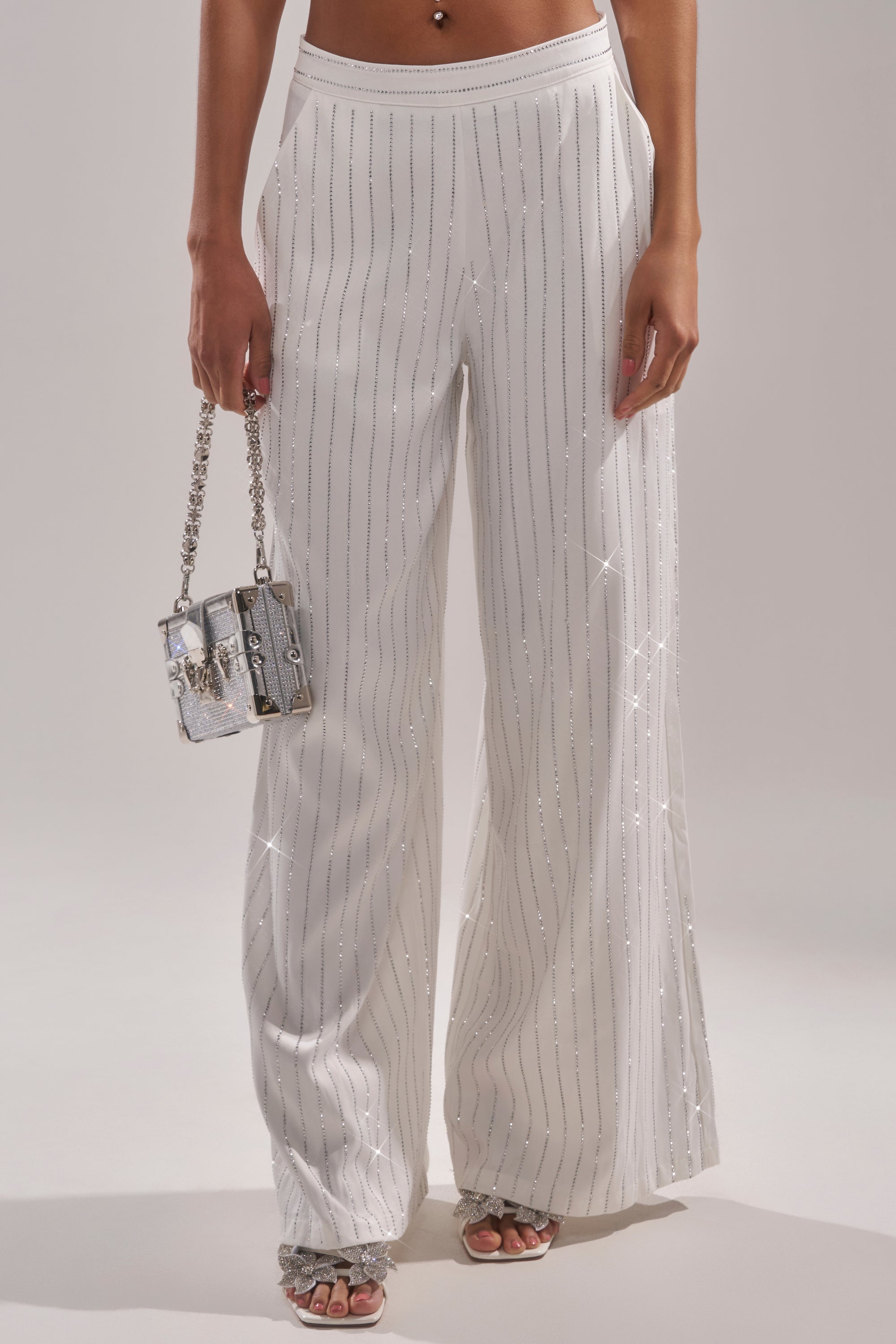 The perfect complement to your tiara. The AKIRA Label Princess Treatment Rhinestone Wide-Leg Pants are crafted from a soft, lightweight fabric and feature a flattering high-rise, wide-leg silhouette, spacious side-slant pockets, and a tonal zip-back closure. Rows of petite silver rhinestones run vertically from waist to hem for fabulous flair. Style them with the coordinating Princess Treatment Halter Top for a look worthy of royalty.