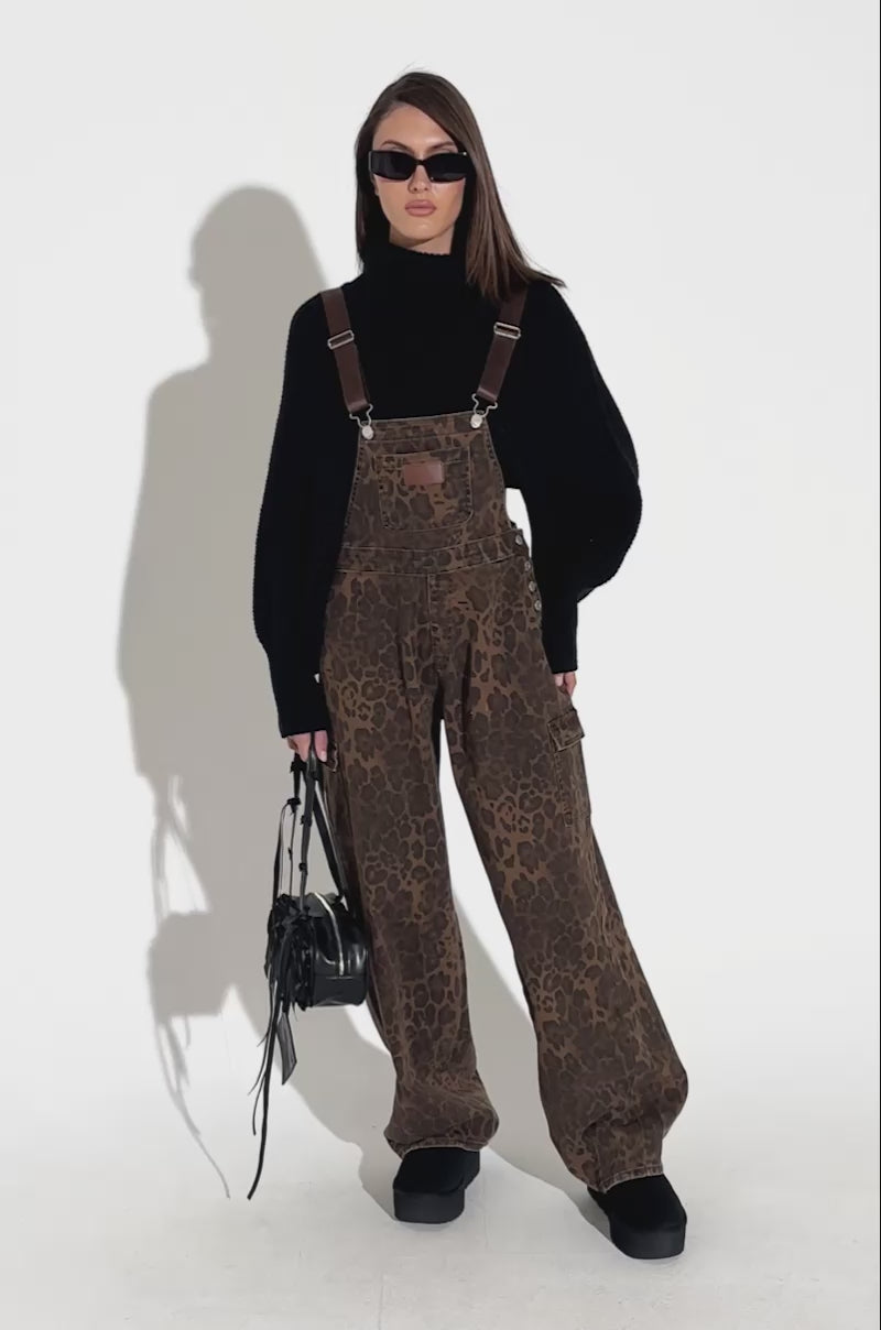 Strap in for a wild ride in The AKIRA Label Pull Up On Me Leopard Overalls. This bold piece is crafted from a structured cotton base and features a classic leopard print throughout, a sleeveless design, adjustable buckled bib straps, a chest pouch with a faux leather applique, exposed sides, and faux silver metallic button closures on each side of the waist. Complete with cargo pockets on the lower legs, and a relaxed, wide leg silhouette. Style with a cropped baby tee and chunky loafers for a funky ensemble.