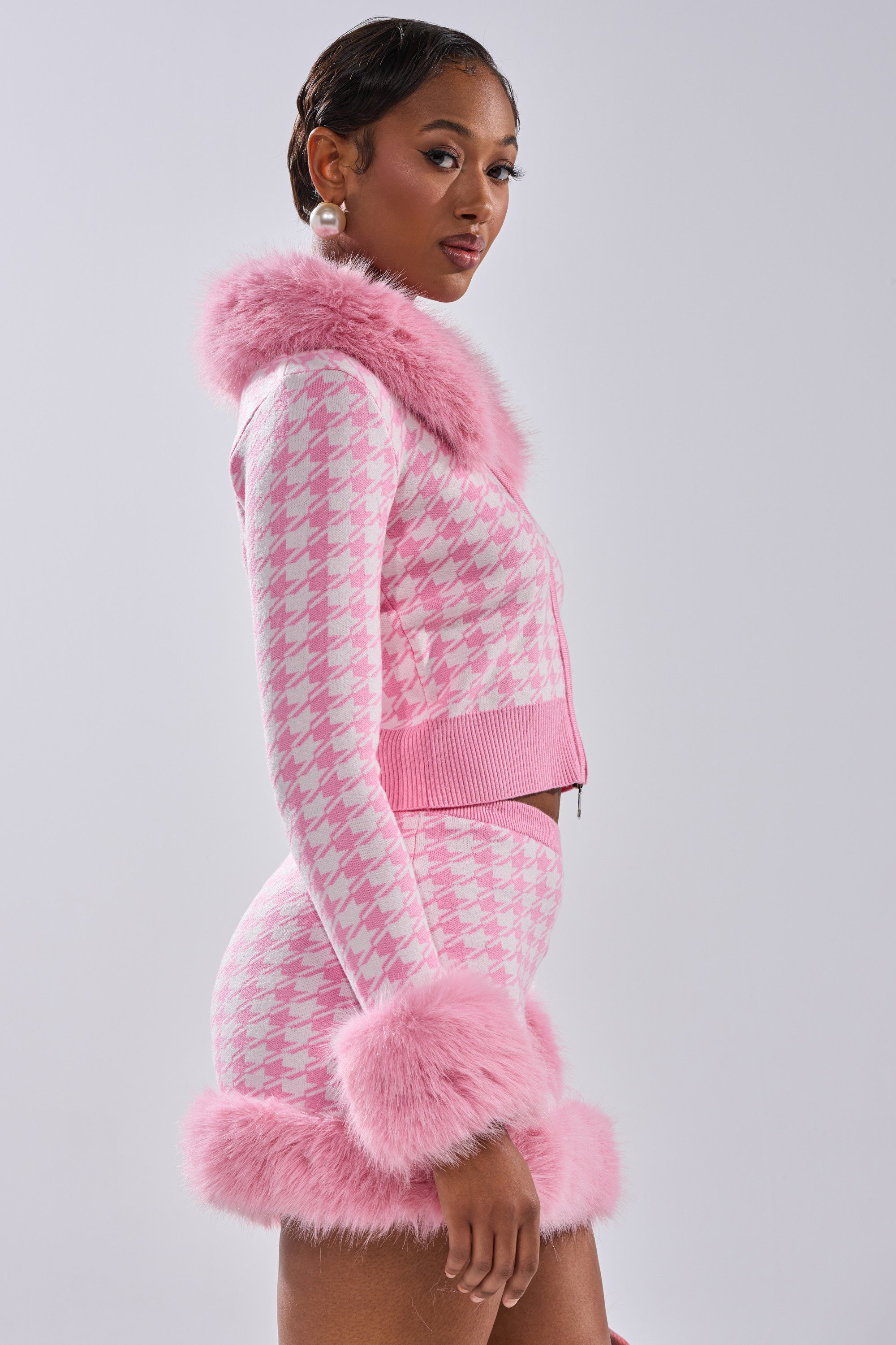 Hi Barbie! The AKIRA Label Queen of Love Sweater with Fur Trim is crafted from a soft, stretchy knit with a houndstooth pattern. Brought to you in a delicious shade of bubblegum pink, this cutesy ‘lil cardigan features a cropped fit, ribbed hem, zip-front closure, and plush, detachable faux fur accents at the collar and sleeve cuffs for fabulous flair. Pair it with matching Queen of Love Sweater Skirt and platform boots for a sugary sweet finish.