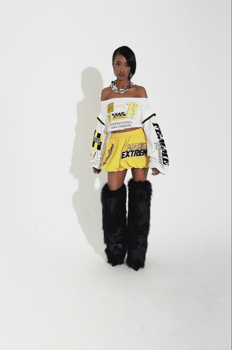 Ride in the fast lane with The AKIRA Label Racing Through Off The Shoulder Sweatshirt. This stylish top is crafted from a cozy cotton blend fabrication and features a stretchy, off-the-shoulder neckline with inner elastic trim, long sleeves that boast color block striped detailing at the shoulders, elastic cuffs, and ruched detailing on the lower arms, a coordinating elasticized waistband, and racing-inspired embroidered graphics and text on the front, back, and sleeves. Complete with a lightweight inner lining, and a relaxed, cropped silhouette. Pair with low rise, baggy jeans, and platform sneakers for a finished look.