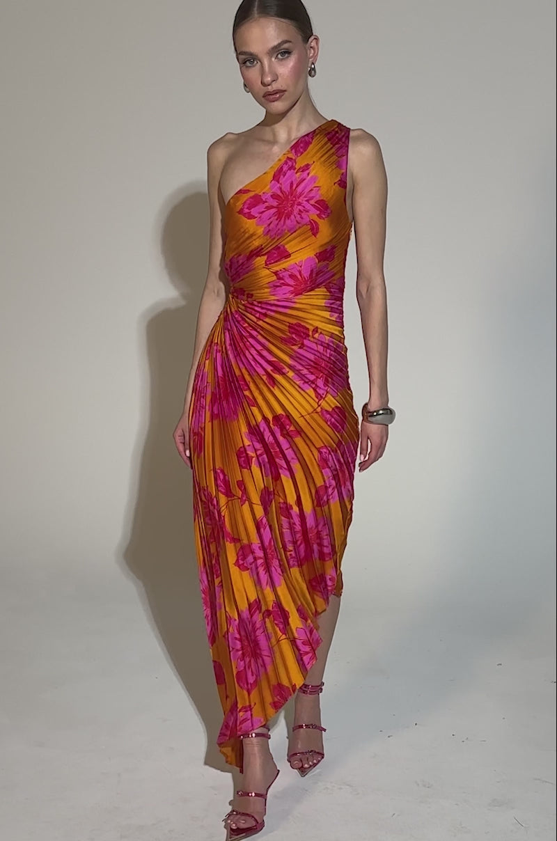 Your aura will be irresistible in The AKIRA Label Radiant Energy Printed Midi Dress. This asymmetrical midi is crafted from a lightweight, flowy fabric and features a vibrant tropical floral print, a pleated construction throughout with a one-shoulder design, a sultry elasticized side cutout at the waist, an angled hemline, a concealed side zipper closure, and a sleek inner lining. Complete with a midi-length, column silhouette. Pair with strappy heels and bold accessories, perfect for weddings, resort evenings, or sunset cocktails.