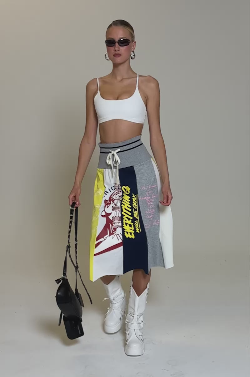 Add sporty-chic flair to your outfit with The AKIRA Label Rebuilt Midi Skirt. Crafted from soft, stretchy cotton, this streetwear-inspired skirt boasts a high-rise, A-line fit, a wide, stretchy ribbed knit waistband with adjustable drawstrings and accent stripes, and a paneled color-block design with assorted, abstract graphics throughout.
