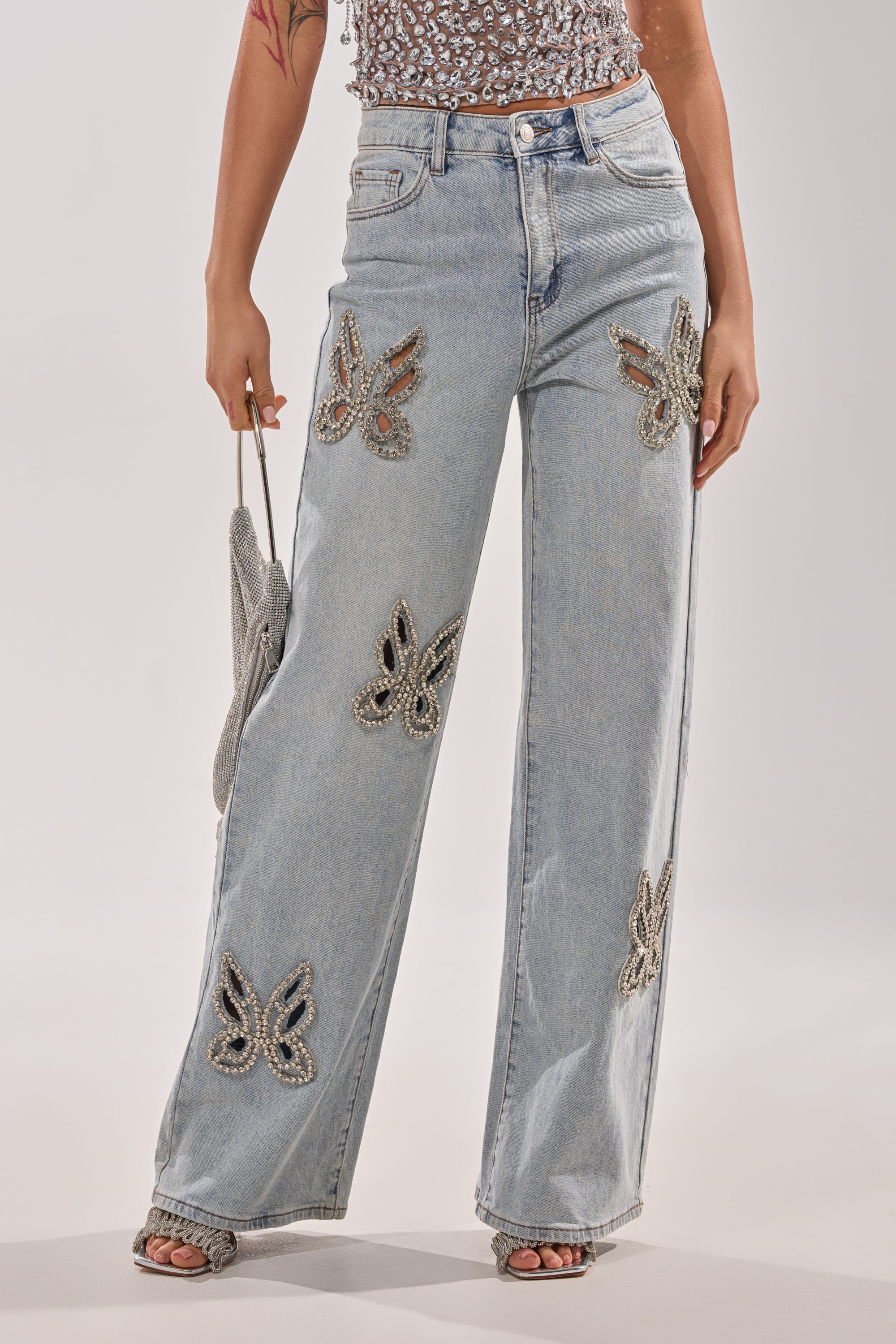 RHINESTONE BUTTERFLY CUTOUT DENIM JEANS