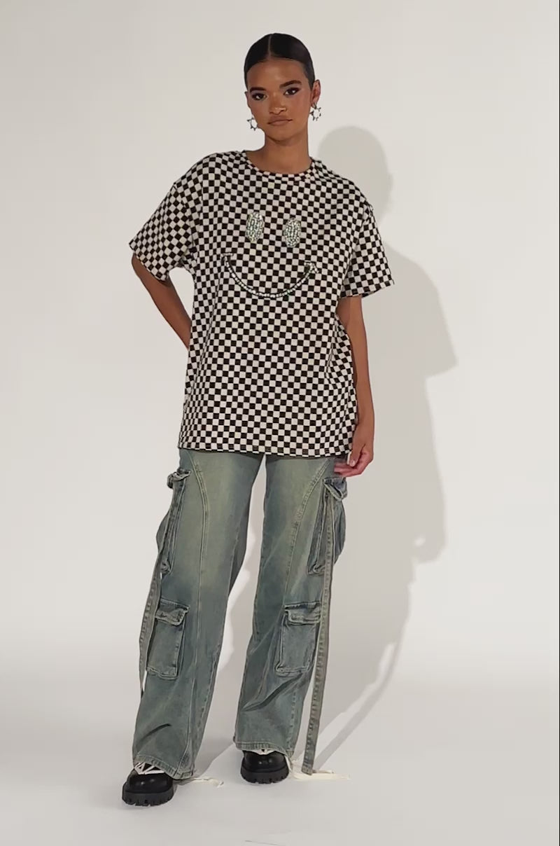 RHINESTONE SMILEY FACE OVERSIZED CHECKERED TSHIRT