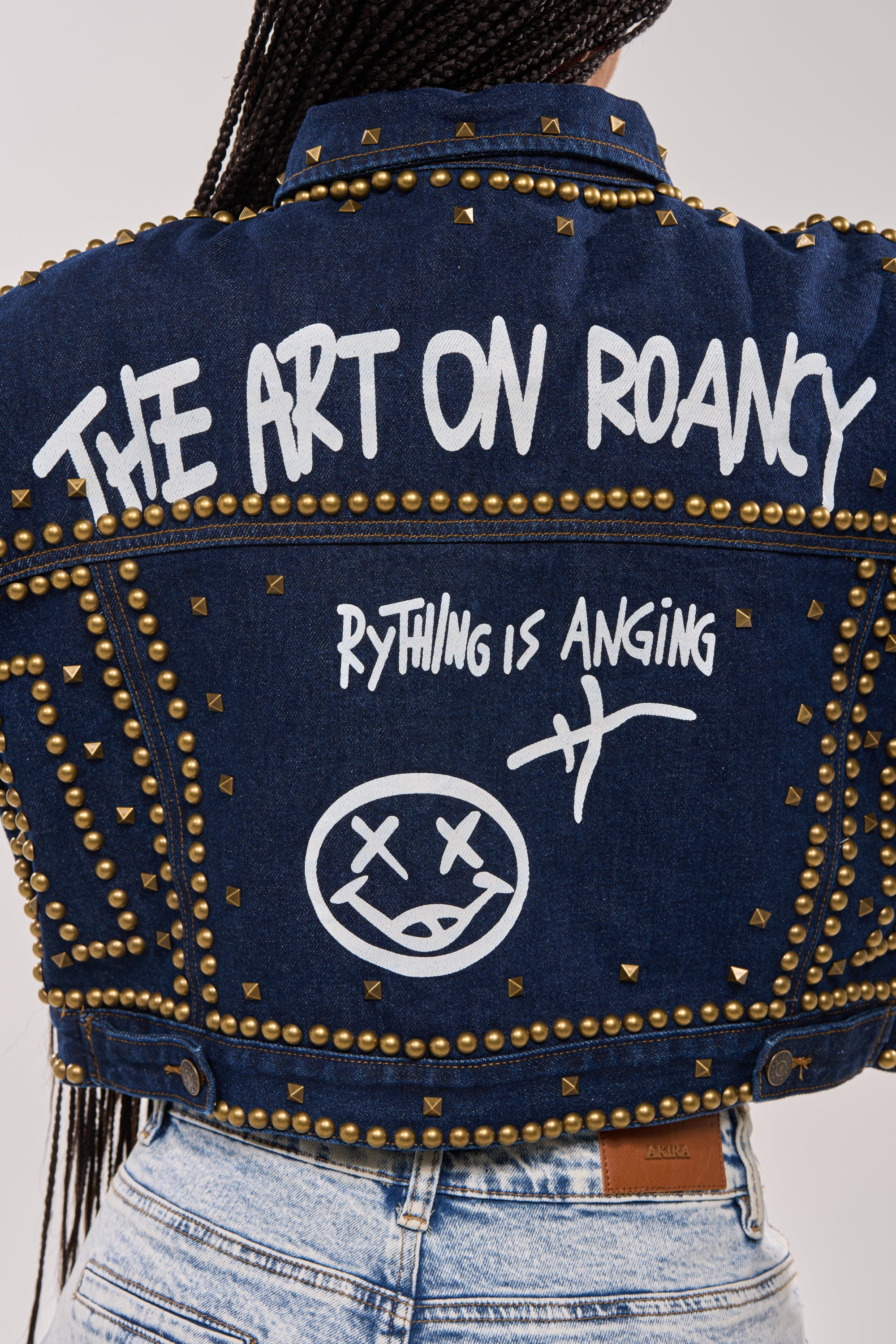 Head-turning studded denim graffiti lettering jacket designed to elevate streetwear looks or statement layering with edgy, high-impact attitude. Featuring allover metallic stud detailing, bold graffiti-style graphic text, and hand-painted accents throughout, this cropped silhouette delivers a rebellious, punk-inspired aesthetic with standout texture. The structured denim construction, classic collar, front pockets, and button-front closure balance the artistic design with timeless jacket appeal. Style it over tees, hoodies, or mini dresses for an effortlessly cool, fashion-forward finish.