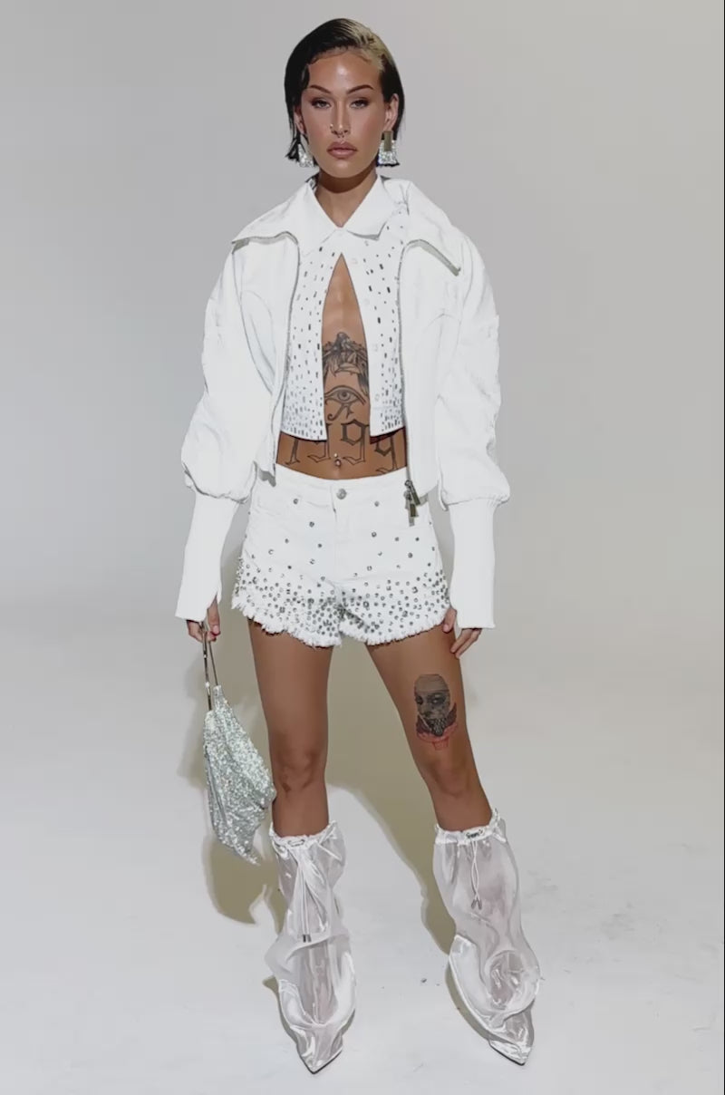 RILEE EMBELLISHED DENIM SHORTS IN WHITE