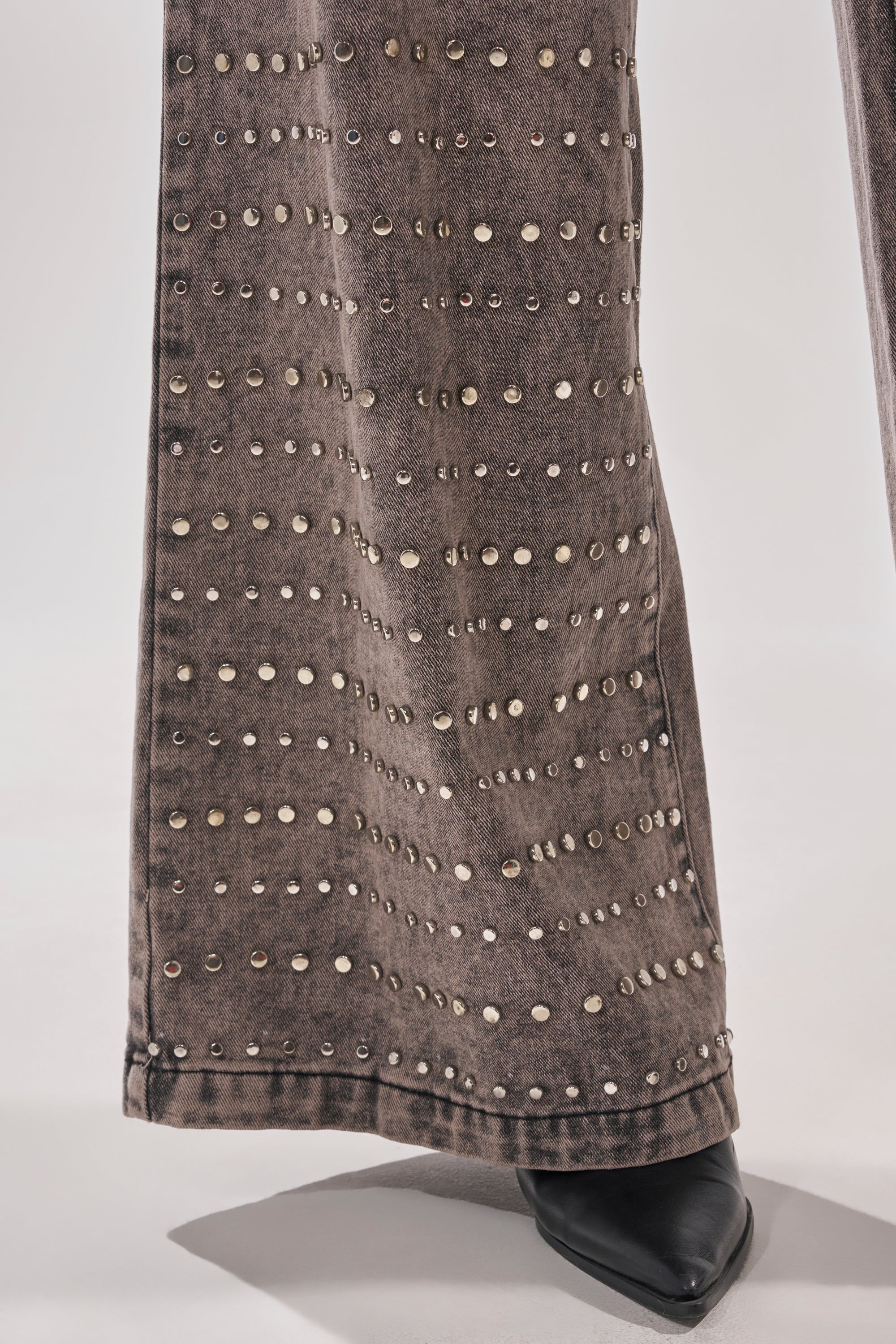 “Tell me about it, stud.” The AKIRA Label Rizzo Studded Wide Leg Denim gives the perfect modern edgy look with an all over pattern of metallic grommet studs that add bold texture and a rocker-inspired vibe. Designed with a flattering high waist, classic five-pocket styling, and a dramatic flared silhouette, these grey acid-wash statement jeans elevate any outfit from casual to standout. Style with the matching AKIRA Label Rizzo Studded Denim Jacket for a complete look.