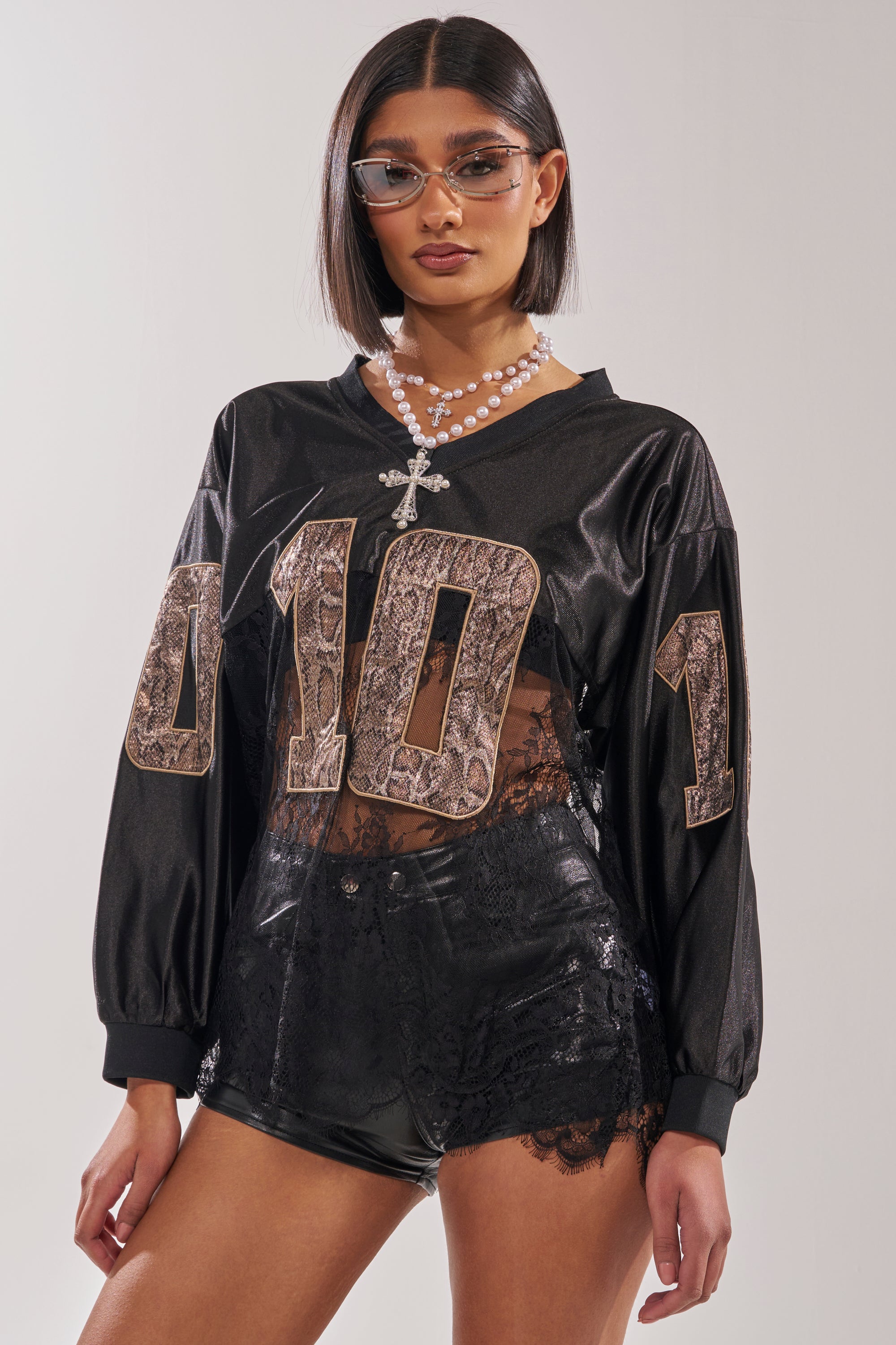 Oversized lace jersey top that brings major game-day energy with a sultry twist. Featuring varsity-style numerical appliqués with metallic snakeskin-inspired detailing, a classic V neckline, relaxed drop shoulders, long sleeves with cinched cuffs, sheer lace paneling, and a scalloped lace hem for a peekaboo finish. The lightweight, oversized fit makes it perfect for layering over a bralette or bodysuit. Style it with cargo pants, platform boots, and hoop earrings for an effortlessly cool, streetwear-ready look.