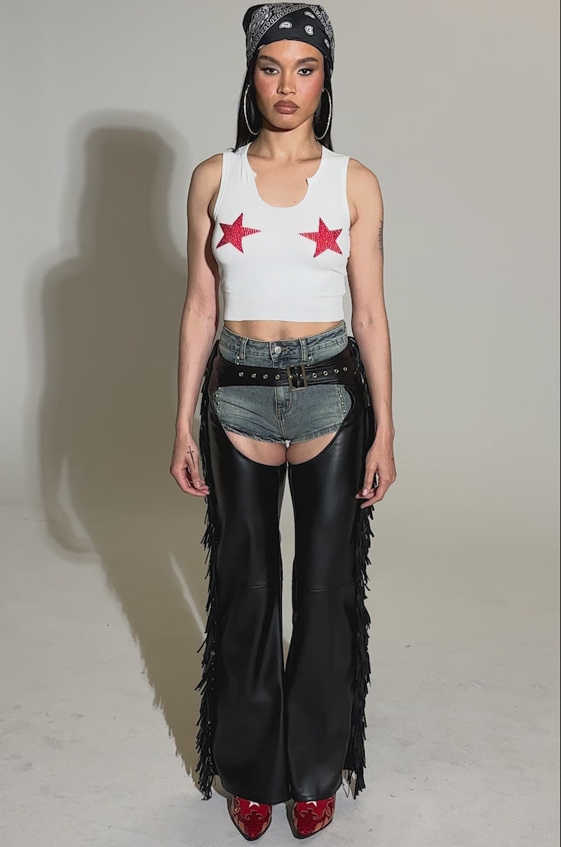 RODEO FRINGE FAUX LEATHER CHAPS