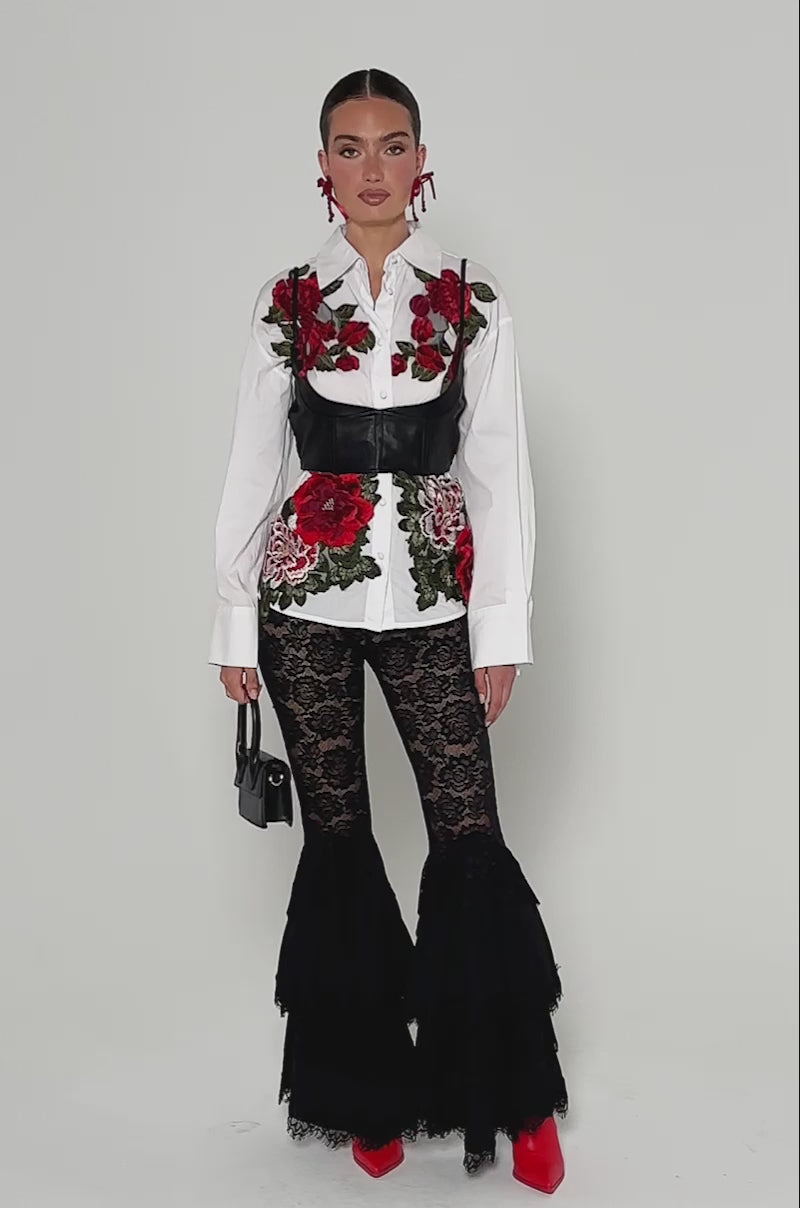 Bouquet all day! The AKIRA Label Rosa Corset Detail Button Down Blouse is a cotton poplin collared shirt featuring long button cuff sleeves, covered button detailing, a long line silhouette, and embroidered, three-dimensional floral appliques throughout. Complete with a removable faux leather underbust corset with adjustable tank straps, boning for structure, an exposed back zipper closure, and sheer smocked backing. Consider styling with a sleek bodycon mini skirt and thigh high boots for a chic and sexy ensemble.