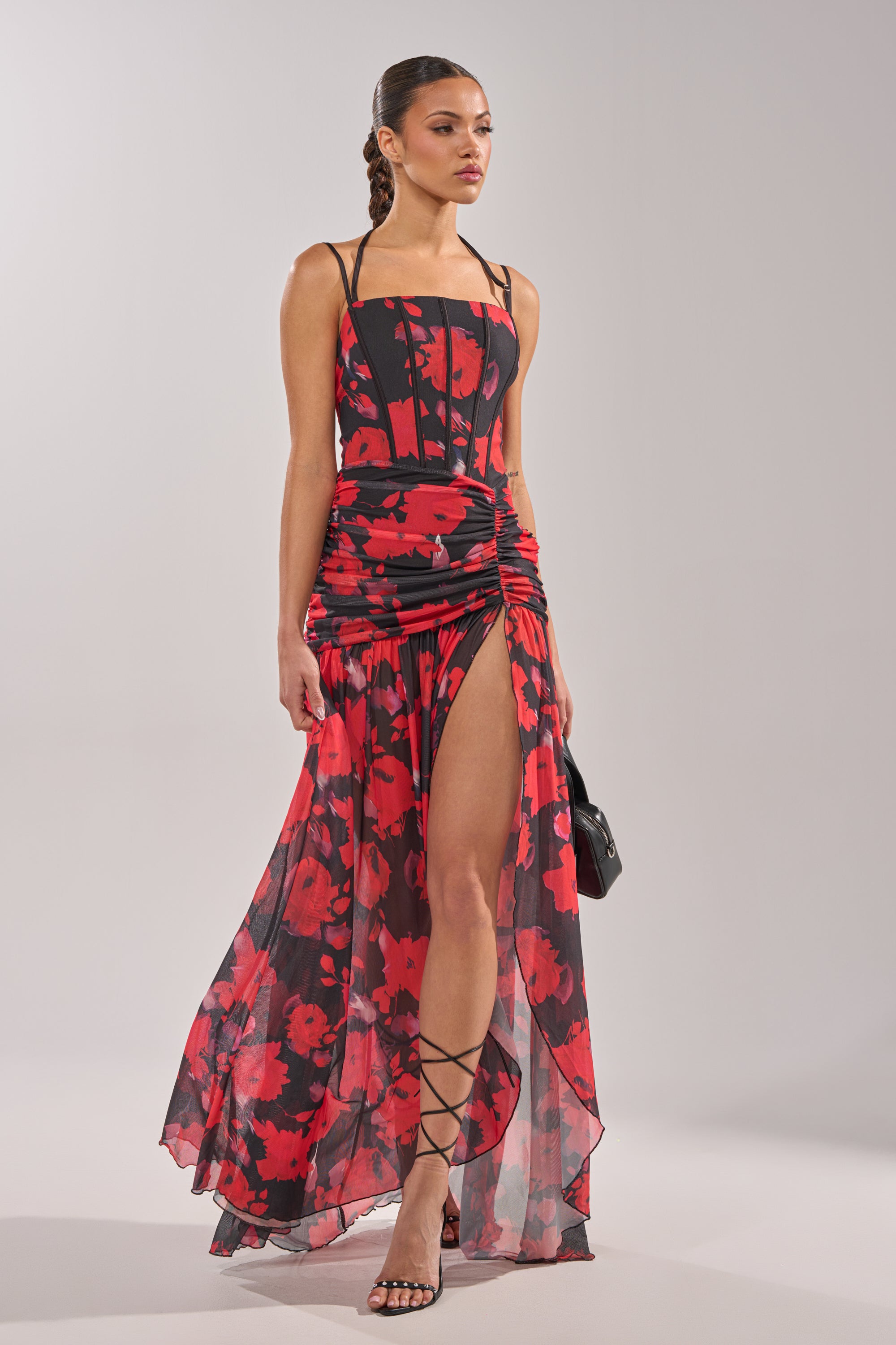 Floral mesh maxi dress, perfect for date night or special occasion styling. Featuring a curve-hugging corset-inspired bodice with adjustable spaghetti straps and an adjustable halter strap, this statement dress stuns in a bold red and black abstract floral print for a sultry, romantic vibe. Ruched detailing through the hips creates a snatched silhouette, while the sheer flowing skirt and dramatic thigh-high slit bring all the movement and drama with every step, finished with a side-zipper enclosure. Pair with strappy heels and glossy glam accessories for a head-turning entrance.