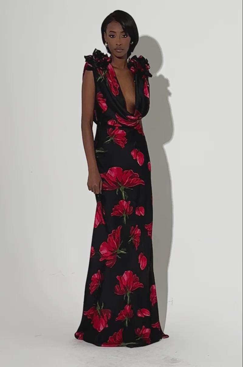 Roses are red, violets are blue, The AKIRA Label Rose Maxi Dress was designed for you! This stunning full-length dress is crafted from a silky-smooth satin fabrication and features a sleeveless, body-skimming silhouette, a plunging cowl neckline, lightly padded shoulders adorned with ruffled, floral-inspired appliques, and a resplendent rose pattern throughout. Complete with a tonal side zipper closure. Style with a sleek black pump and a red lip for a fab formal look.