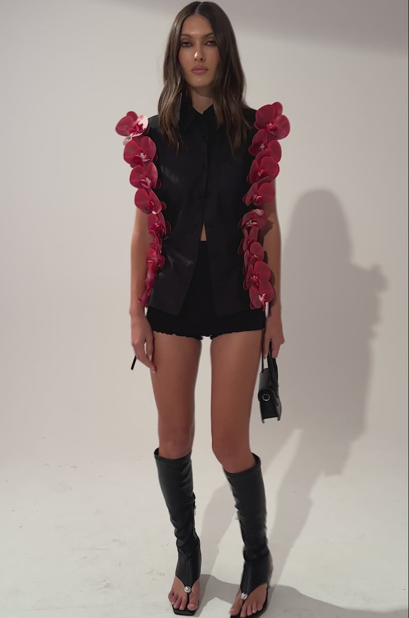 Lookin’ red hot and rosy in The AKIRA Label Rose Petals Button Down. This beachy top is crafted from crisp poplin cotton and features a classic pointed collar, a sleeveless design, exposed sides with tonal self-tie closures, one left chest pocket, and both sides are lined with tropical, 3D floral appliques. Complete with button front closures, and a boxy silhouette. Pair with a mini skirt, platform sandals, and rattan accessories for a finished look.