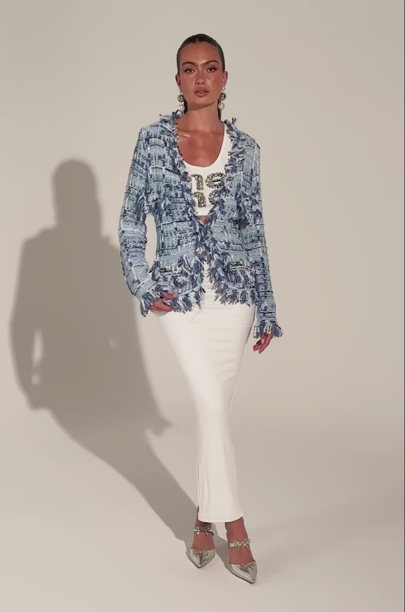 It’s impossible to get the blues when you’re wearing The AKIRA Label Sasha Button Down Cardigan Sweater. This sweet sweater features a chunky, tweed-inspired knit fabrication interwoven with various shades of blue, white, and metallic silver. It features mock breast and waist pockets with embossed, metallic silver buttons, a hook-and-eye front closure, and fringe detailing along the hem and sleeve cuffs. Wear it with baggy jeans and white sneakers for an ideal errand-running ensemble.