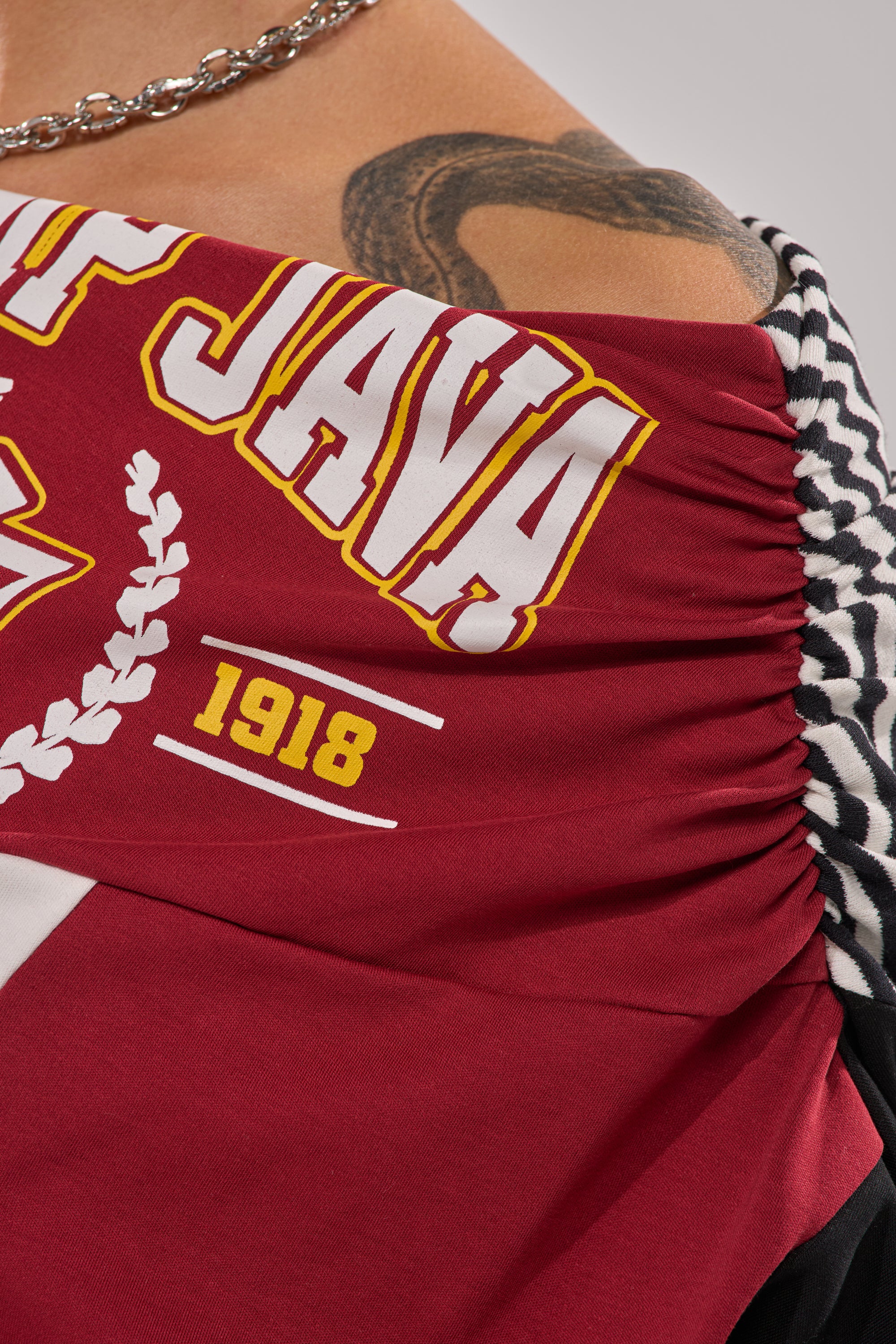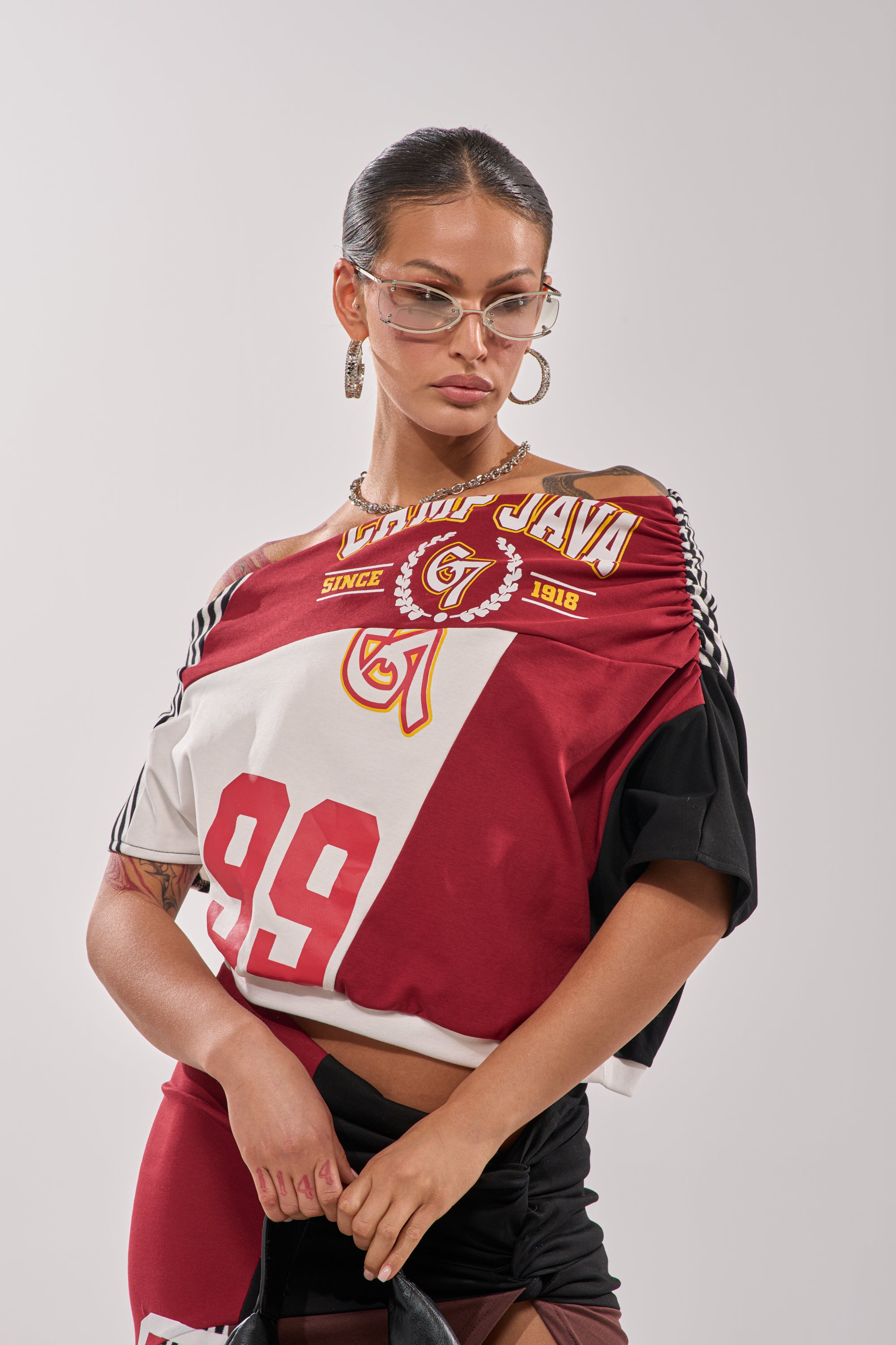 Off-the-shoulder graphic top that serves major game-day energy with a flirty twist. Featuring sporty mixed graphics including varsity-style numerical detailing throughout, an asymmetrical off-the-shoulder neckline, subtle gathered detailing at the left shoulder, relaxed short sleeves, and a cropped fit. Style it with the matching AKIRA Label School Spirit Reworked Midi Skirt and platform sneakers for an effortlessly cool, streetwear-ready look.