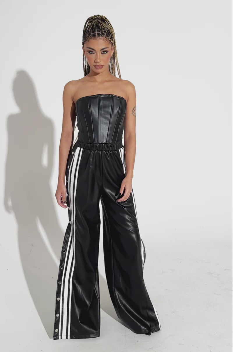 See you next year… Or maybe never. The AKIRA Label See You Next Year PU Jumpsuit is a chic, sporty one-piece crafted from soft, supple faux leather. It features a corset-inspired bodice with structural inner boning, a ruched, elasticized waistband, and wide pantlegs adorned with silver snap buttons and athletic stripes along the side seam. Complete with smooth inner lining and a metallic zip back closure. Style with stilettos and a cropped faux fur jacket for a party-perfect look.
