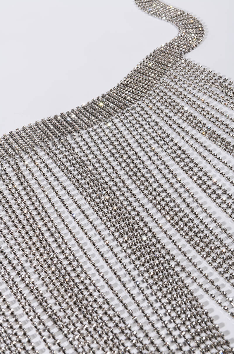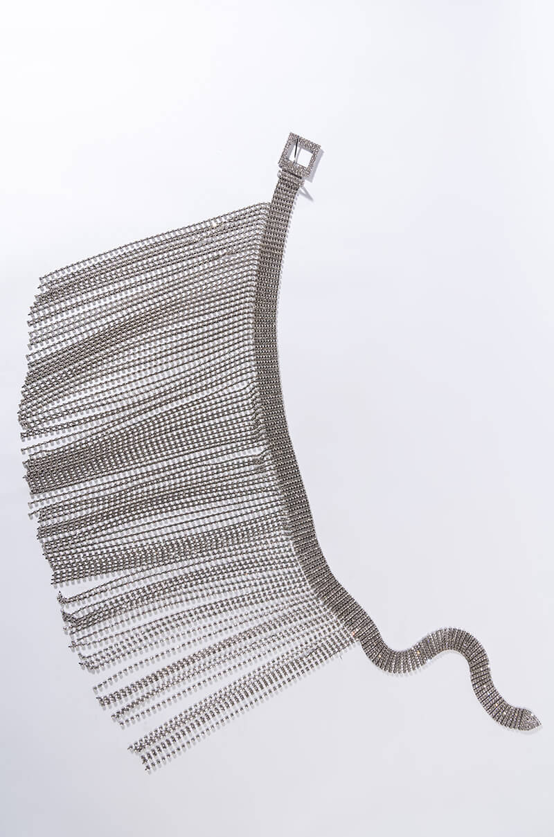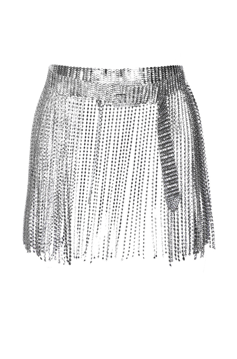 The AKIRA Shake A Tail Feather Rhinestone Fringe Skirt Belt is a glimmering rhinestone accessory sure to spice up any ensemble. This silver metallic piece features a rhinestone-link base, coordinating embellished fringe detailing, and a square belt buckle. Style with a shirt dress for added sex appeal.