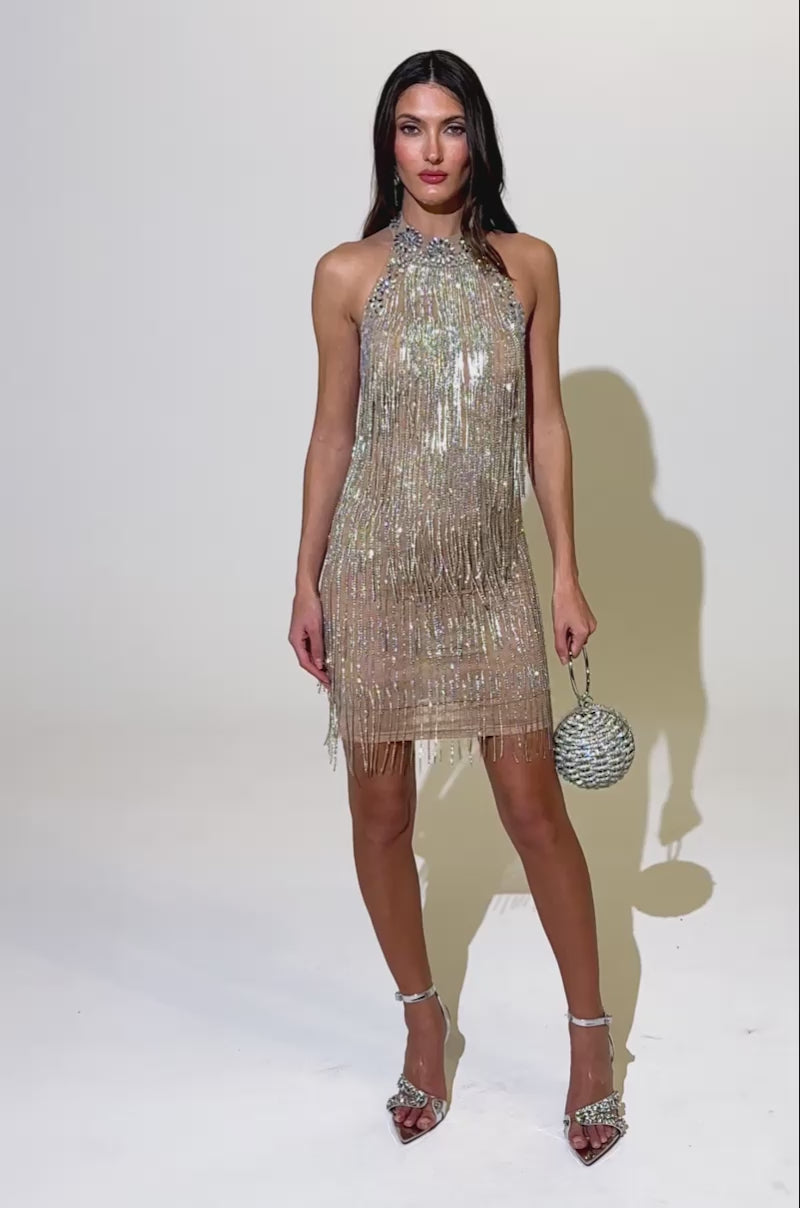 Well the haters gonna hate, hate, hate… I’m just gonna rock The AKIRA Label Shake It Off Mini Dress! This scintillating stunner is crafted from a stretchy, semi-sheer mesh base fabrication and boasts a sleeveless, curve-hugging silhouette, a mock neck with hook-and-eye back fastenings, a sexy open-back design, and a tonal zip-back closure. It’s complete with tiers of cascading, coruscant rhinestone fringe and chunky, floral-inspired rhinestone embellishments along the neckline and arm-openings. This blinged-out beauty will have you feeling so confident, you’ll stay out too late and go on too many dates… Or at least, that’s what people will say.