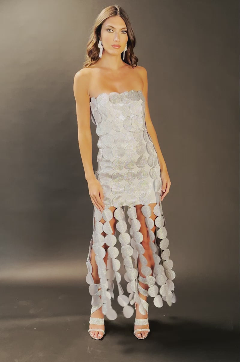 SHE IS THE MOMENT STRAPLESS RHINESTONE DISC MAXI DRESS
