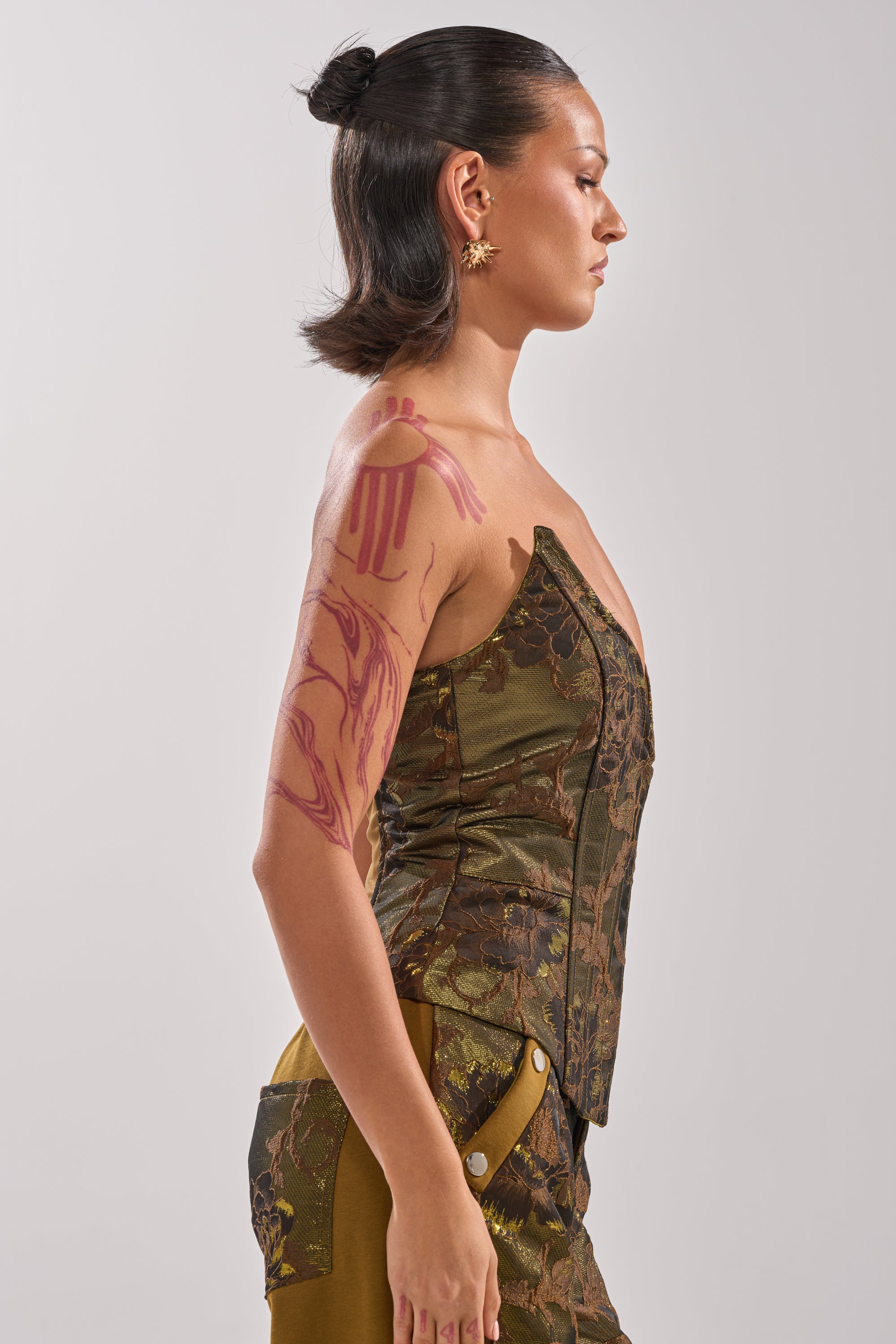 The holidays are bright, but you’re brighter in the AKIRA Label Shigo Brocade Corset. Crafted from a high-shine, jacquard fabric, this sculptural top features a strapless design, a dramatic pointed neckline with inner wire reinforcement, full boning throughout the bodice to contour the waist, a stretchy elasticized back panel, and a full-length back zip closure. Complete with a snug, cropped fit. Pair with the coordinating AKIRA Label Shigo Brocade Bolero, a pleated skirt, and stiletto pumps for a fabulous finish.