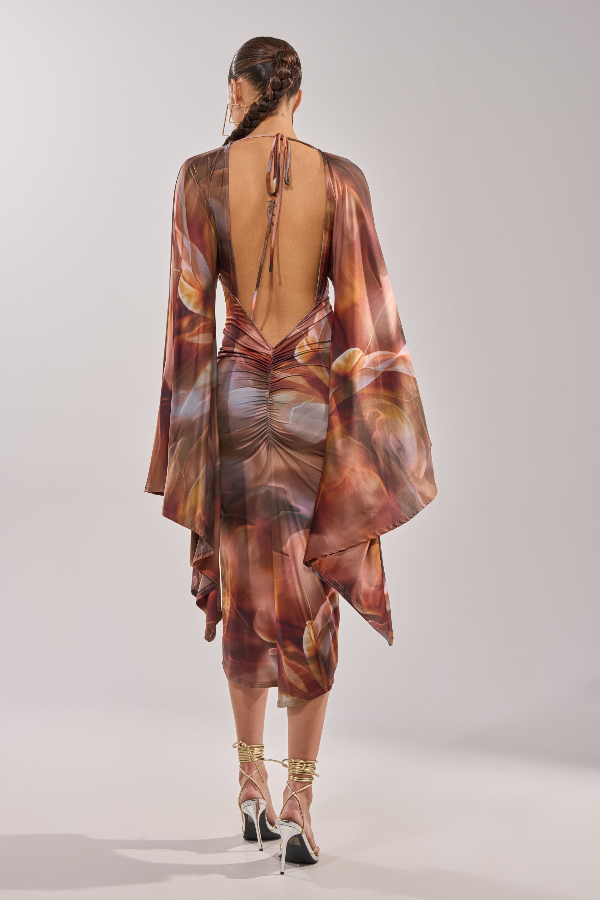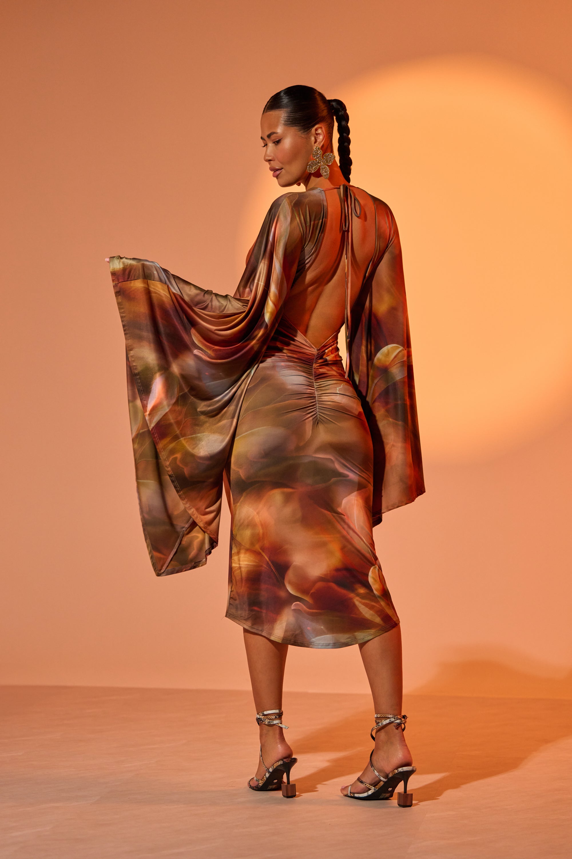 Make a striking entrance in the AKIRA Label Shiny Like Me Maxi Dress. This abstract-print maxi dress features a rich blend of earthy, marble-inspired tones that create a fluid, artistic effect from every angle. Designed with a dramatic plunge neckline, elongated draped bell sleeves, an open back with a tie enclosure, ruching on the rear, and a sleek, body-skimming silhouette, this statement dress delivers high-fashion movement and modern elegance. Pair with a turquoise chunky heel for a pop of color!