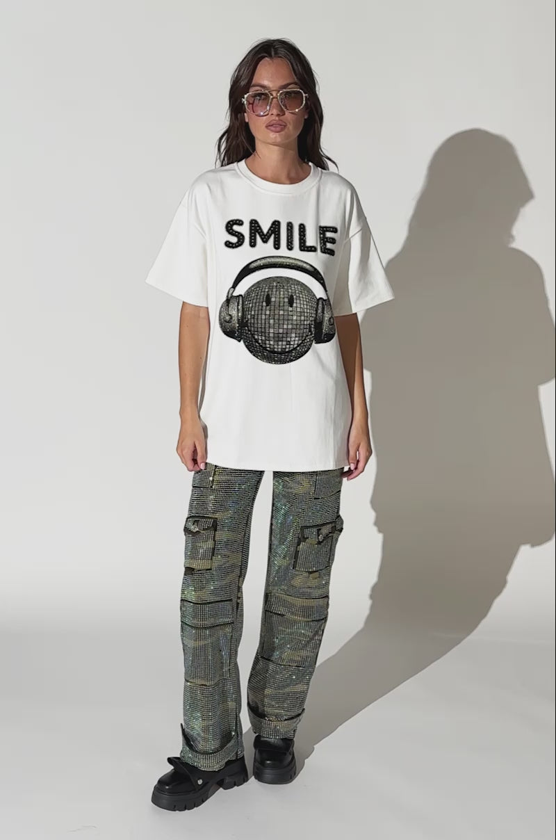SMILE RHINESTONE DETAIL OVERSIZED TSHIRT IN WHITE