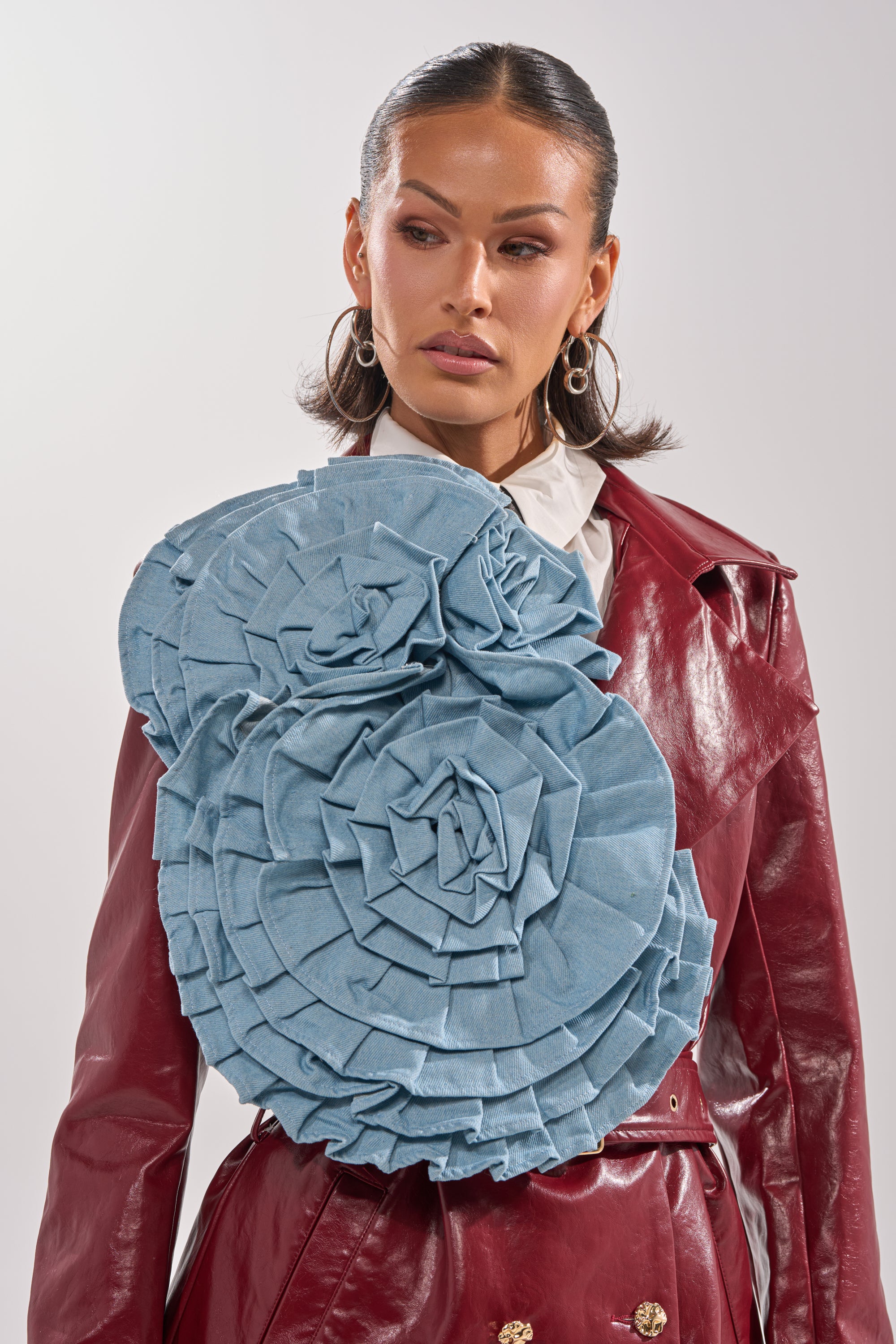 I dream of denim! The AKIRA Label So Fine Denim Brooch is an oversized, 3D double flower brooch made from a sky blue denim material. Each flower has its own safety pin fastening for easy attachment to any skirt, top, or purse for an elevated avant garde look.