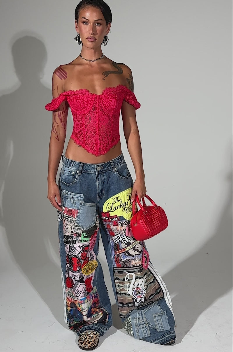 The AKIRA Label So Sick Patchwork Oversized Jeans don’t just make a statement, they start conversations. These maximalist jeans are crafted from medium-wash denim adorned with an explosion of mixed-media appliqués, graphic prints, embroidered patches, and layered textures from front to back. These mid-rise, baggy-fit jeans feature functional belt loops, adjustable buckle detailing on each side of the waist, a classic five-pocket design, and raw-edge hemlines. Complete with a classic button-zip front closure. Perfect for styling with a basic crop top, oversized tee, or fitted blouse for an eclectic finish.