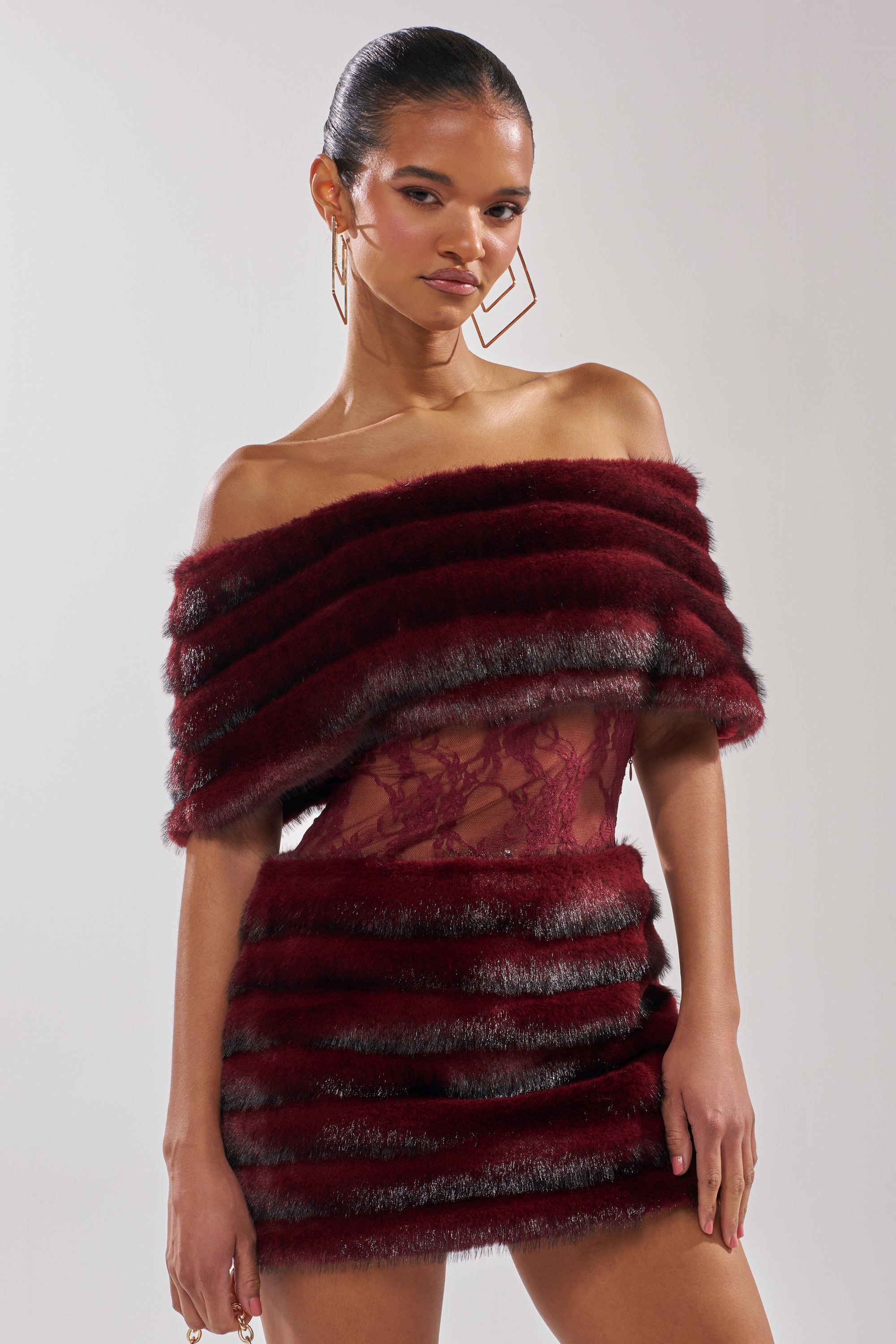 The AKIRA Label Soft Cherry Sleeveless Mini Dress will have you looking lavish in lace! This luxurious burgundy mini dress features a striking combination of plush faux-fur tiered panels that ombre into black and intricate lace detailing along the bodice for a rich, high-fashion look. Designed with a dramatic off-shoulder fur capelet with an inner elastic trim and a sculpted silhouette with a hidden side zipper enclosure, this statement piece brings texture, depth, and elegance to any special occasion. Pair with long red gloves and matching maroon heels for a chic monochromatic look sure to stun!