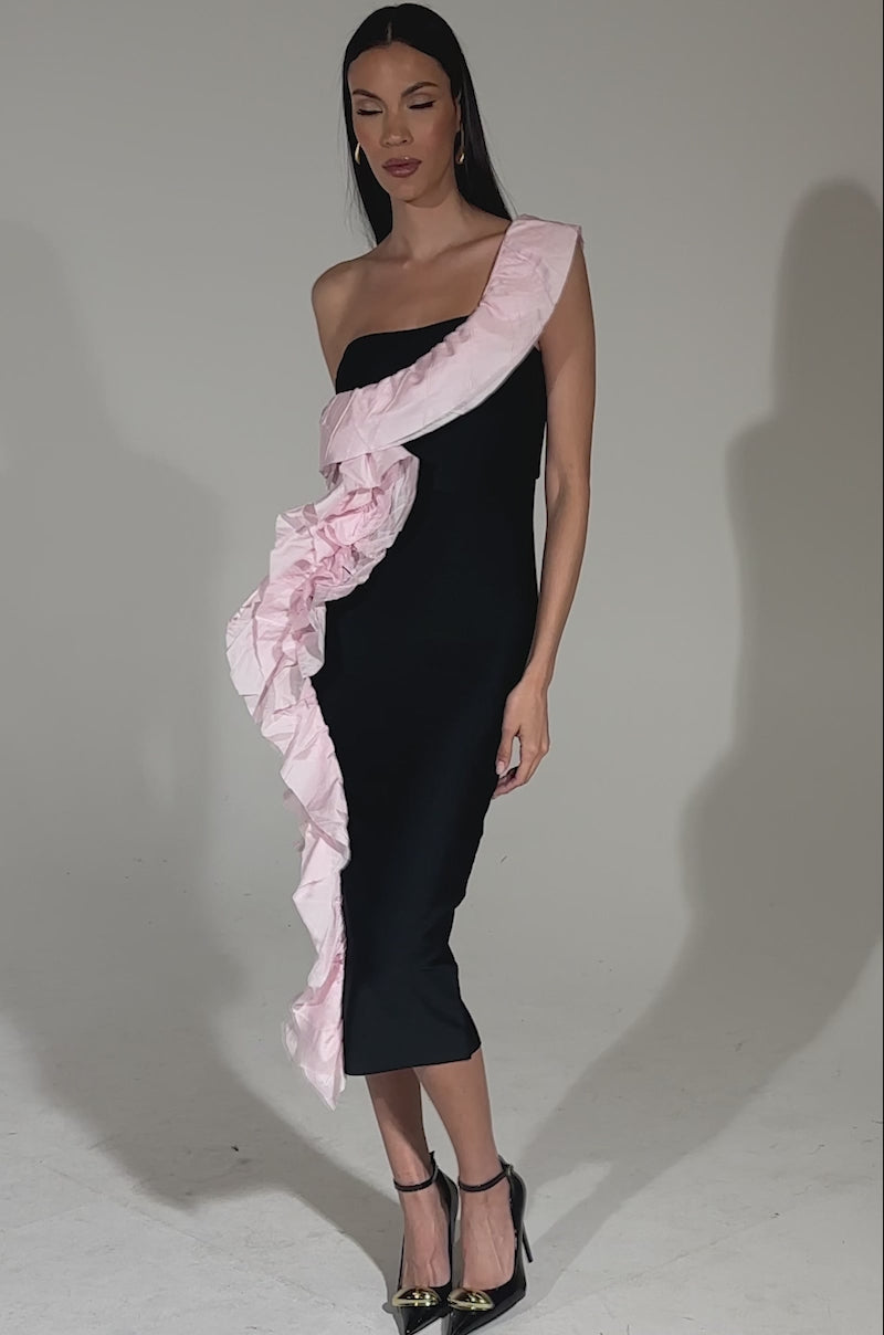 Live for the applause in The AKIRA Label Soft Flex Bandage Midi Dress With Ruffle Detail. Crafted from a stretchy bandage fabric, this dress features a one-shoulder neckline adorned with a cascading pink organza ruffle trim that sweeps dramatically from shoulder to hem, a concealed back zipper closure, and a sculpting, figure-hugging fit. Complete with a midi-length silhouette. Perfect for cocktail parties, galas, weddings, or red carpet-inspired evenings, this statement dress pairs beautifully with minimalist heels and sleek accessories.