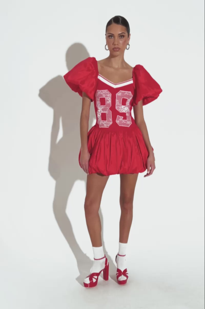You’re the MVP in The AKIRA Label Sorry I’m Late Jersey Mini Dress. This sporty-chic cutie features a multi-media construction comprised of a soft and stretchy cotton-blend bodice against a slick n’ swishy polyester skirt and coordinating sleeves. It boasts a fit ‘n flare silhouette, a ribbed knit V-neckline with an athletic accent stripe, dramatically puffy short sleeves, a puffy, pleated skirt, and a tonal side zipper closure. Complete with soft inner lining and a prominent, lacy “89” jersey number on the front and back.