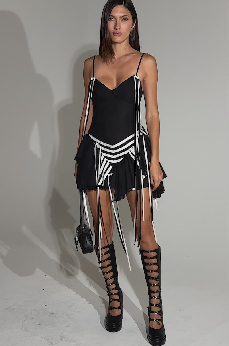 Stay winning the style game in The AKIRA Label Sporty Spice Ruffle Mini Dress. Crafted from a lightweight fabric, this athletic-chic LBD features a sweetheart neckline, adjustable spaghetti straps with contrast ribbons at the base, a fitted bodice with a back zipper closure, and one mock flap pocket. The lower half boasts a flirty, asymmetrically layered chiffon skirt trimmed in contrast striped detailing with cascading ribbon accents. Complete with a mini-length silhouette. Style with anything from kitten heels to platform sneakers for a versatile finish.