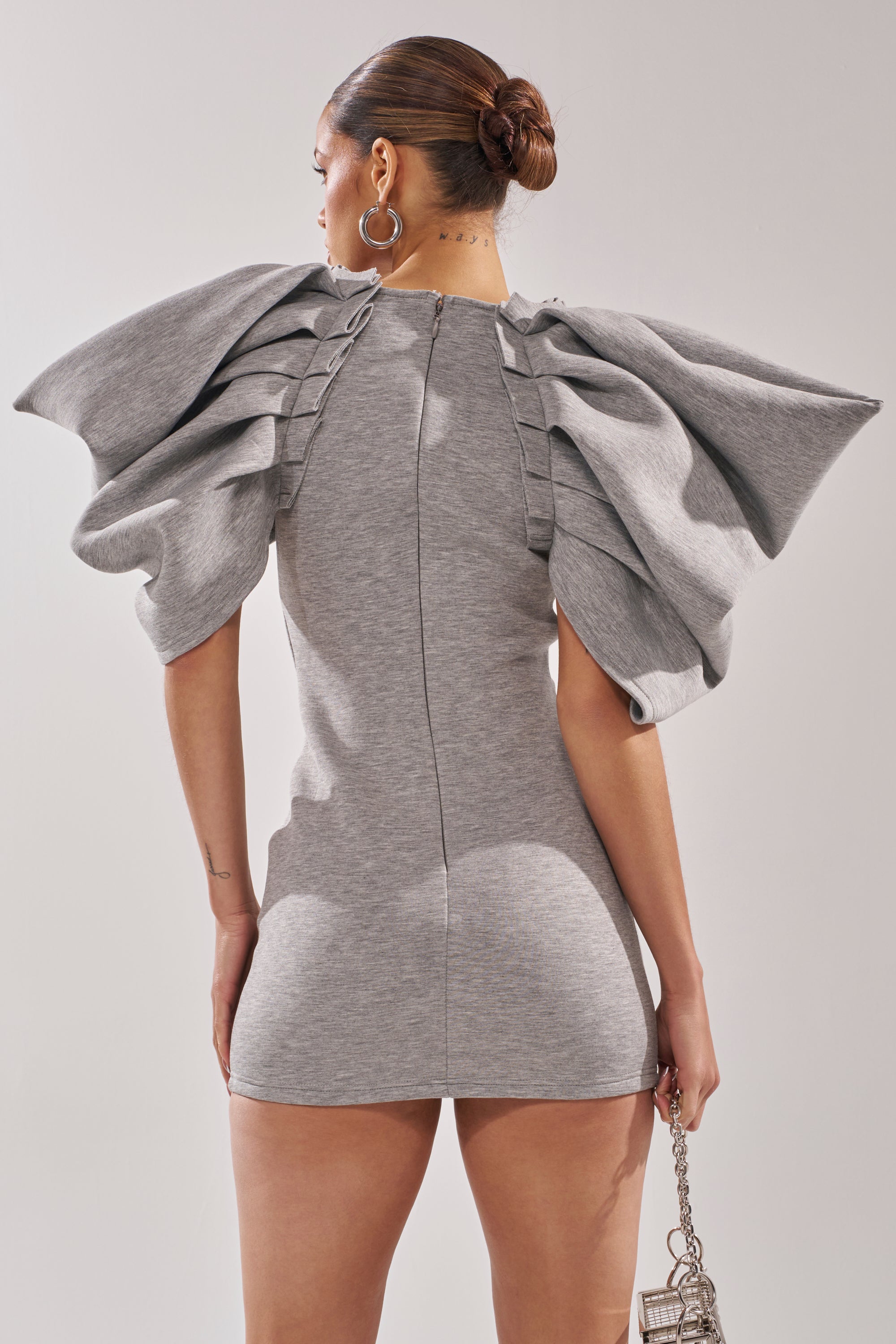 This dramatic heather grey bodycon mini dress is crafted from a soft, stretchy woven knit fabric with oversized sculptural ruffle sleeves and bold front ruffle trim for a runway-inspired statement. It features a wide rounded neckline, exaggerated winged shoulders, voluminous tiered ruffle sleeves, a vertical ruffle detail that runs down the front for added dimension, a back zip closure, and a curve-hugging fit. Complete with a mini-length silhouette. Style it with strappy heels and sleek hair for a chic, event-ready vibe.