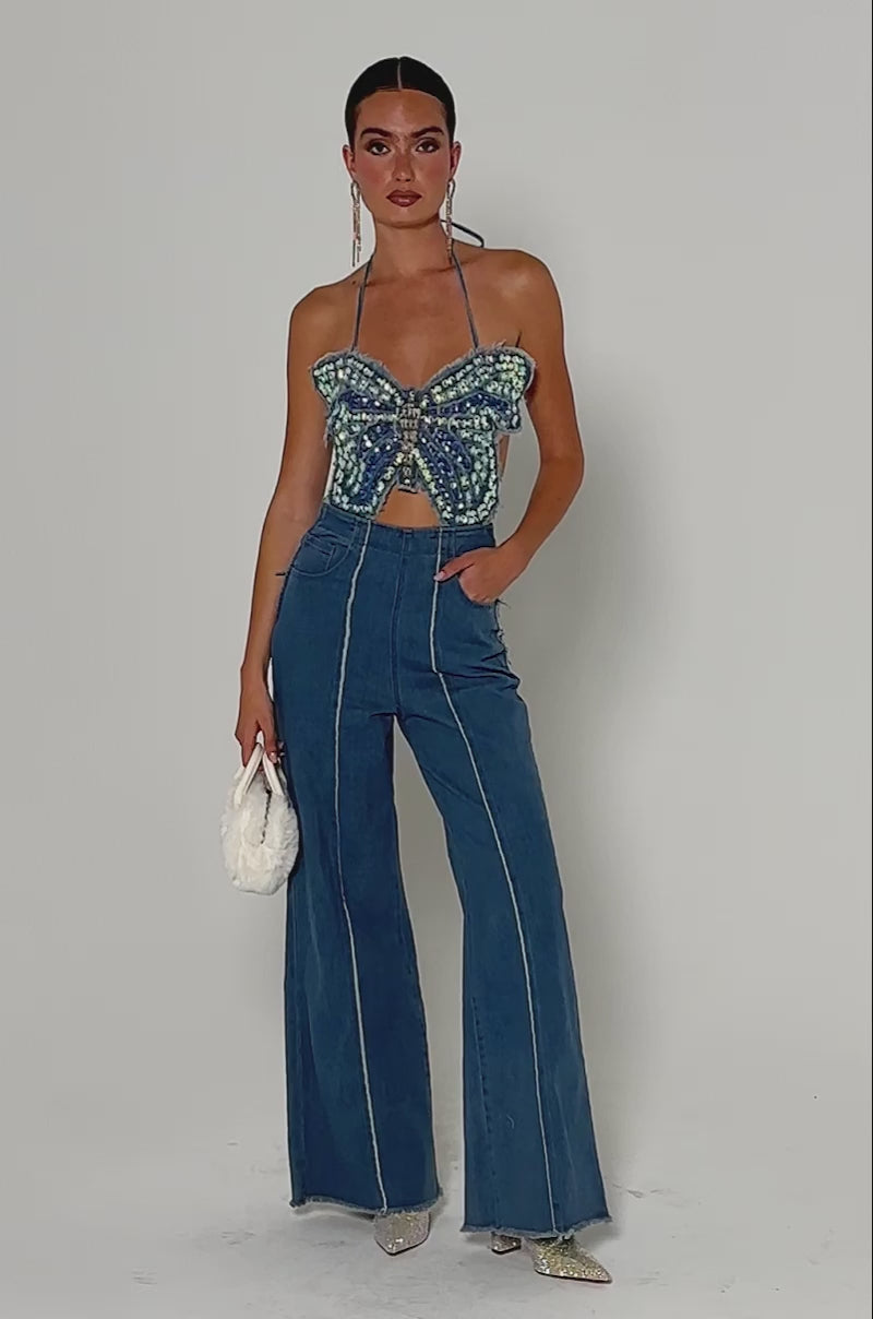 You look fly AF in The AKIRA Label Spread Your Wings Denim Butterfly Jumpsuit. This standout piece is crafted from soft, supple denim and boasts a butterfly-shaped bodice adorned with iridescent sequins and beads, a frayed, raw neckline, a midriff cutout, and adjustable, self-tie halter straps. It’s complete with wide pantlegs, spacious waist pockets, frayed hems, a side zip closure, and tonal, embroidered butterflies with distressed detailing on the rear. Style it with a pair of holographic platform sandals for a fun festival look.
